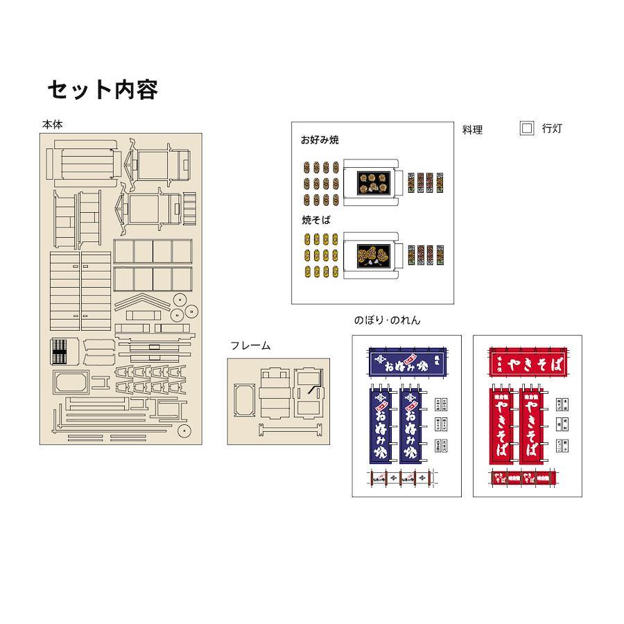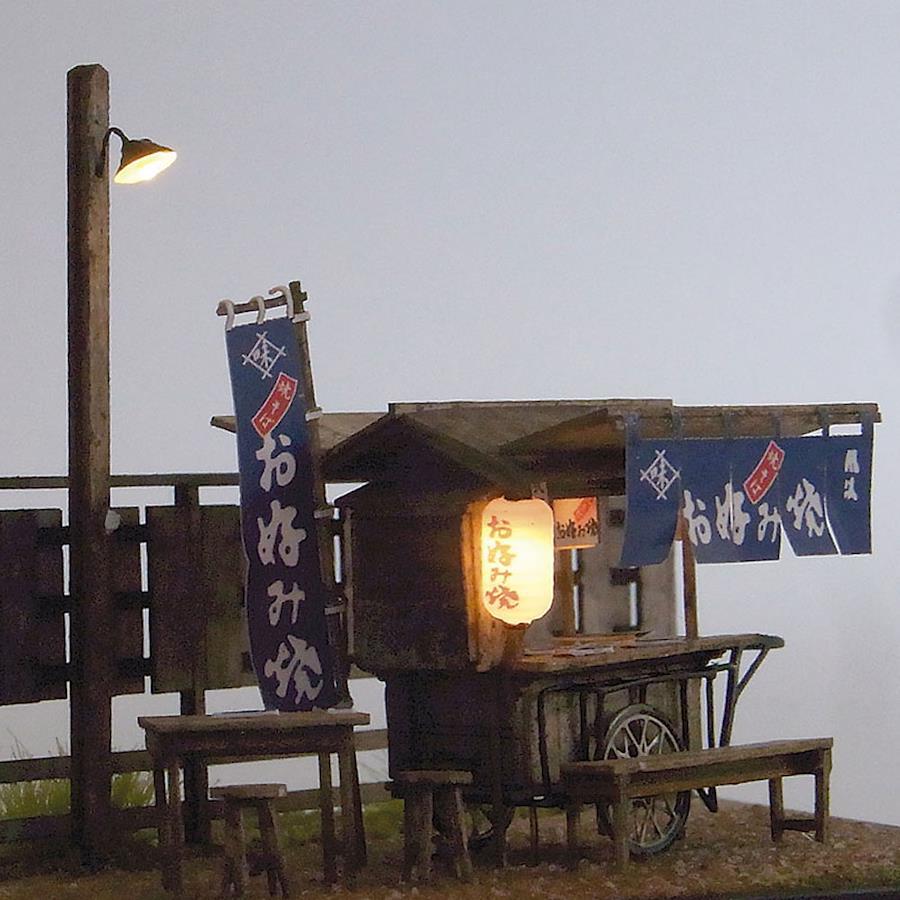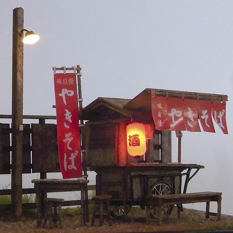 別売のリヤカー、情景ステージ、ちょうちん、電球色LED、電灯笠などを組み合わせています。