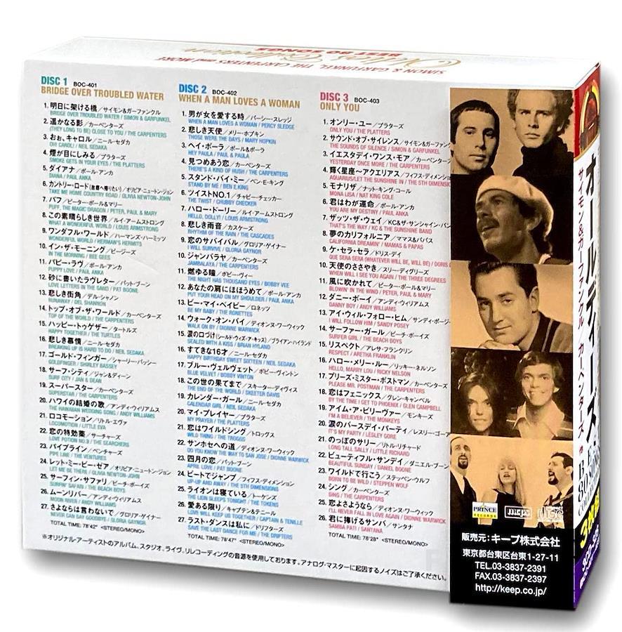 ディスク 1 1. 明日に架ける橋 / サイモン&ガーファンクル 2. 遥かなる影 / カーペンターズ 3. おぉ、キャロル / ニール・セダカ 4. 煙が目にしみる / プラターズ 5. ダイアナ / ポール・アンカ 6. カントリー・ロード 故郷へ帰りたい / オリビア・ニュートン・ジョン 7. パフ / ピーター・ポール&マリー 8. この素晴らしき世界 / ルイ・アームストロング 9. ワンダフル・ワールド / ハーマンズ・ハーミッツ 10. イン・ザ・モーニング / ビージーズ 11. パピー・ラヴ / ポール・アンカ 12. 砂に書いたラヴレター / パット・ブーン 13. 悲しき街角 / デル・シャノン 14. トップ・オブ・ザ・ワールド / カーペンターズ 15. ハッピー・トゥゲザー / タートルズ 16. 悲しき慕情 / ニール・セダカ 17. ゴールド・フィンガー / シャーリー・バッシー 18. サーフ・シティ / ジャン&ディーン 19. スーパースター / カーペンターズ 20. ハワイの結婚の歌 / アンディ・ウィリアムス ディスク 2 1. 男が女を愛する時 / パーシー・スレッジ 2. 悲しき天使 / メリー・ホプキン 3. ヘイ・ポーラ / ポール&ポーラ 4. 見つめあう恋 / カーペンターズ 5. スタンド・バイ・ミー / ベン・E・キング 6. ツイストNO.1 / チャビー・チェッカー 7. ハロー・ドーリー / ルイ・アームストロング 8. 悲しき雨音 / カスケーズ 9. 恋のサバイバル / グロリア・ゲイナー 10. ジャンバラヤ / カーペンターズ 11. 燃ゆる瞳 / ボビー・ヴィー 12. あなたの肩にほほうめて / ポール・アンカ 13. ビー・マイ・ベイビー / ロネッツ 14. ウォーク・オン・バイ / ディオンヌ・ワーウィック 15. 涙の口づけ / シールド・ウィズ・ア・キッス ブライアン・ハイランド 16. すてきな16才 / ニール・セダカ 17. ブルー・ヴェルヴェット / ボビー・ヴィントン 18. この世の果てまで / スキーター・ディヴィス 19. カレンダー・ガール / ニール・セダカ 20. マイ・プレイヤー / プラターズ 21. 恋はワイルドシング / トロッグス 22. サンホセへの道 / ディオンヌ・ワーウィック 23. 四月の恋 / パット・ブーン 24. ビートでジャンプ / フィフス・ディメンション 25. ライオンは寝ている / トーケンズ 26. 愛ある限り / キャプテン&テニール 27. ラスト・ダンスは私に / ドリフターズ ディスク 3 1. オンリー・ユー / プラターズ 2. サウンド・オブ・サイレンス / サイモン&ガーファンクル 3. イエスタデイ・ワンス・モア / カーペンターズ 4. 輝く星座 アクエリアス / フィフス・ディメンション 5. モナリザ / ナット・キング・コール 6. 君はわが運命 / ポール・アンカ 7. ザッツ・ザ・ウェイ / KC&ザ・サンシャイン・バンド 8. 夢のカリフォルニア / ママス&パパス 9. ケ・セラ・セラ / ドリス・デイ 10. 天使のささやき / スリー・ディグリーズ 11. 風に吹かれて / ピーター・ポール&マリー 12. ダニー・ボーイ / アンディ・ウィリアムス 13. アイ・ウィル・フォロー・ヒム / サンディ・ポージー 14. サーファー・ガール / ビーチ・ボーイズ 15. リスペクト / アレサ・フランクリン 16. ハロー・メリー・ルー / リッキー・ネルソン 17. プリーズ・ミスター・ポストマン / カーペンターズ 18. 恋はフェニックス / グレン・キャンベル 19. アイム・ア・ビリーヴァー / モンキーズ 20. 涙のバースデイ・パーティ / レスリー・ゴーア 21. のっぽのサリー / リトル・リチャード 22. ビューティフル・サンデイ / ダニエル・ブーン 23. ワイルドで行こう / ステッペン・ウルフ 24. シング / カーペンターズ 25. 恋よさようなら / ディオンヌ・ワーウィック 26. 君に捧げるサンバ / サンタナ メディア掲載レビューほかディスク 3 1. オンリー・ユー ( プラターズ ) 2. サウンド・オブ・サイレンス ( サイモン&ガーファンクル ) 3. イエスタデイ・ワンス・モア ( カーペンターズ ) 4. 輝く星座 アクエリアス ( フィフス・ディメンション ) 5. モナリザ ( ナット・キング・コール ) 6. 君はわが運命 ( ポール・アンカ ) 7. ザッツ・ザ・ウェイ ( KC&ザ・サンシャイン・バンド ) 8. 夢のカリフォルニア ( ママス&パパス ) 9. ケ・セラ・セラ ( ドリス・デイ ) 10. 天使のささやき ( スリー・ディグリーズ ) 11. 風に吹かれて ( ピーター・ポール&マリー ) 12. ダニー・ボーイ ( アンディ・ウィリアムス ) 13. アイ・ウィル・フォロー・ヒム ( サンディ・ポージー ) 14. サーファー・ガール ( ビーチ・ボーイズ ) 15. リスペクト ( アレサ・フランクリン ) 16. ハロー・メリー・ルー ( リッキー・ネルソン ) 17. プリーズ・ミスター・ポストマン ( カーペンターズ ) 18. 恋はフェニックス ( グレン・キャンベル ) 19. アイム・ア・ビリーヴァー ( モンキーズ ) 20. 涙のバースデイ・パーティ ( レスリー・ゴーア ) 21. のっぽのサリー ( リトル・リチャード ) 22. ビューティフル・サンデイ ( ダニエル・ブーン ) 23. ワイルドで行こう ( ステッペン・ウルフ ) 24. シング ( カーペンターズ ) 25. 恋よさようなら ( ディオンヌ・ワーウィック ) 26. 君に捧げるサンバ ( サンタナ ) --.