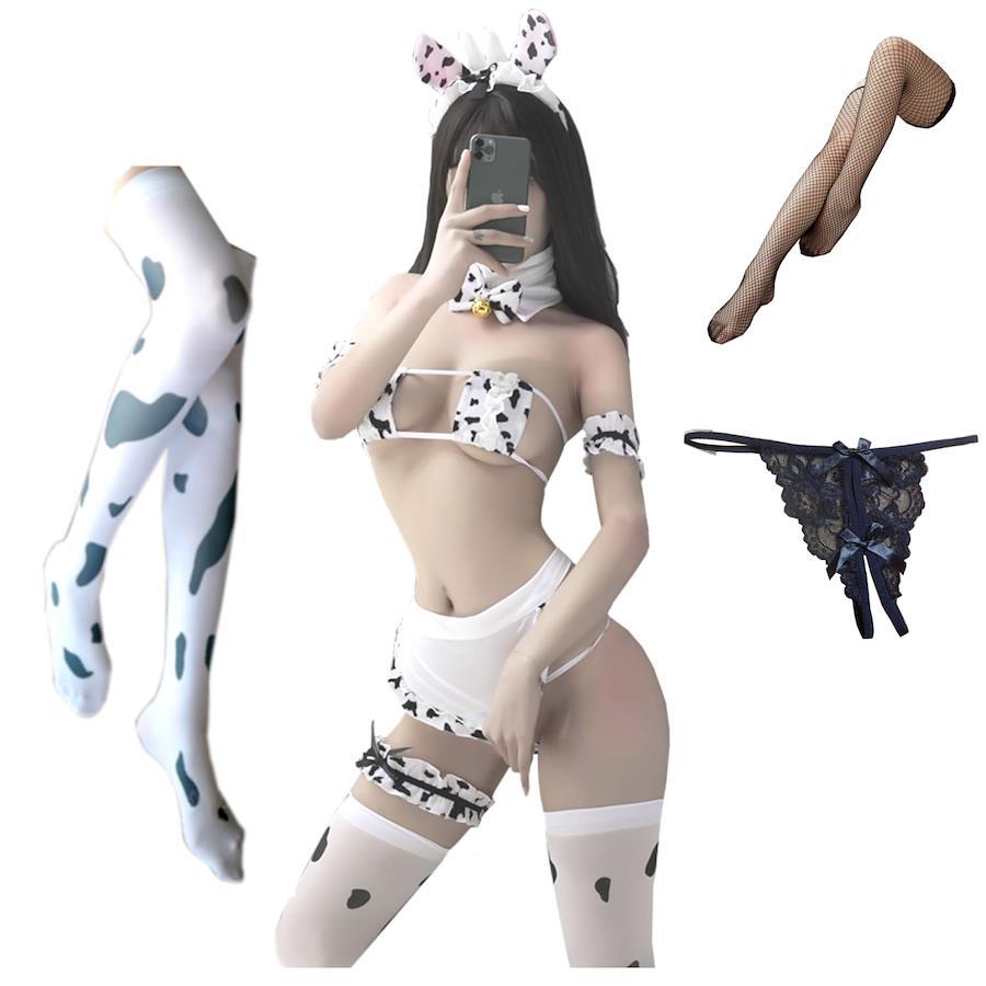 OLYOLY 14-Piece Set: Extremely Tiny Micro Bikini, Cow Print Cosplay Lingerie, Brazilian Thong Panties, Eyepatch Bra, See-Through Sexy Lingerie