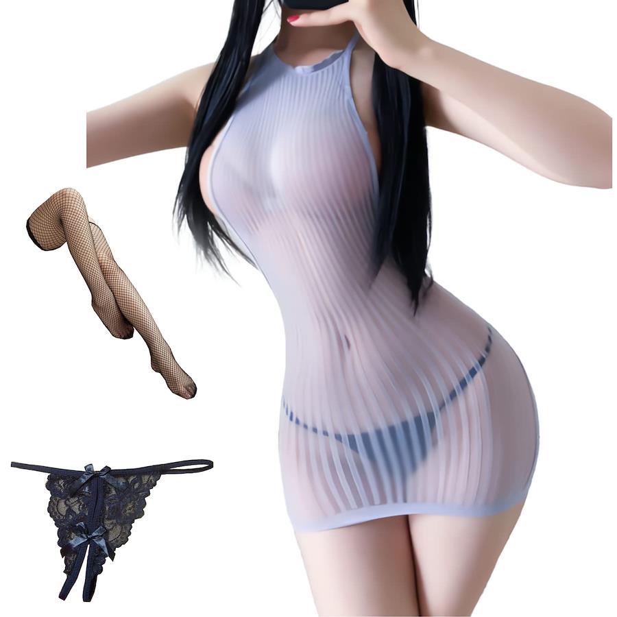 OLYOLY [3-Piece Set] Extremely Sheer Mini Skirt Bodycon Dress Babydoll Micro Mini Cosplay Lingerie Sexy Women's Perforated T-Shirt