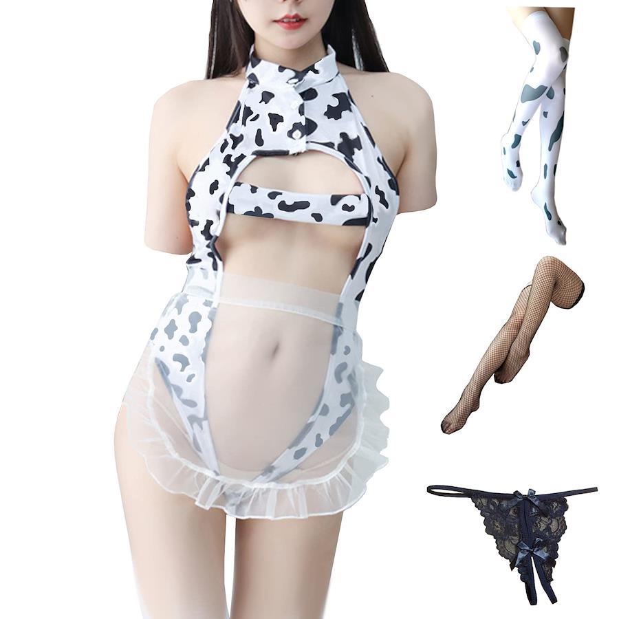 【使用上の注意】 洗濯はぬるま湯にて軽く手洗い・室内干しを推奨。色物は色落ちしますので白物と一緒の選択は避けてください。衣類に接着されているアクセサリーなどは洗濯により外れることがあります。海外製品につき、糸のほつれや縫製の甘い部分などはご了承願います。生産ロットにより予告なく仕様が変更されることがあり、写真と異なる場合は現物を優先とさせていただきます。下着類はデリケートな素材が多いため、着脱時に爪やアクセサリーなどで引っ掻いたりしないようご注意ください。 こんな用途におすすめ:ハロウィン・クリスマス・バレンタインデー・忘年会・新年会・コスプレパーティ等の余興、イベント衣装やインナーとして。インスタ・SNS・グラビア・記念写真など撮影用衣装として。結婚記念日・結婚祝い・婚約祝い・出産祝いなど記念日のプレゼントやジョークグッズとして。男性が着用可能なコスプレもございます。女装用・セックスレス・マンネリ化の解消にも。アニメキャラ・癒し・萌え・熟女・学生・SM系~過激ベビードール・極小マイクロビキニ・ボディストッキング・スクール水着など、人気セクシーランジェリーから注目のデザインをセレクト。 穴あき・胸開き・透ける素材・ハイレグ・Tバック・紐パン・レースなど、異なるバリエーションからお好みのセット・単品が選べます。梱包サイズ?:?30x22x3cmでの取り扱い開始日?:?2021/8/10メーカー?:?OLYOLYASIN?:?B09C7XBWRG売れ筋ランキング:ドラッグストア-124,366位(ドラッグストアの売れ筋ランキングを見る)アダルト用コスチューム-1,288位登録情報取り扱い案内 洗濯機洗い【商品内容】牛柄レオタード&エプロン風ミニスカート&牛柄ニーハイソックスのセット+穴あきTバックショーツ+ニーハイストッキング=計5点セット【サイズ】女性用フリーサイズ(S~XXL相当)首回り:37cm、ウェスト:~110cm、ヒップ:~120cm、丈:63cm(スカート丈:29cm)【カラー】ホワイト×ブラック(ストッキングとショーツのカラー・デザインはおまかせになります)【特徴】セクシーで可愛い牛柄のメイド風アニコス下着◎オープンバストな超ハイレグレオタードにレースのエプロン風ミニスカートを組み合わせ。ホルターネックはボタン留め、アンダー部分はホックで着脱可能。レオタードは伸びがよく大きなサイズ・男性の着用にも対応します。こちらは牛柄ニーハイとのセットです。(#lf)(#lf)(#lf)商品購入前に、ストア紹介ページをご確認ください。