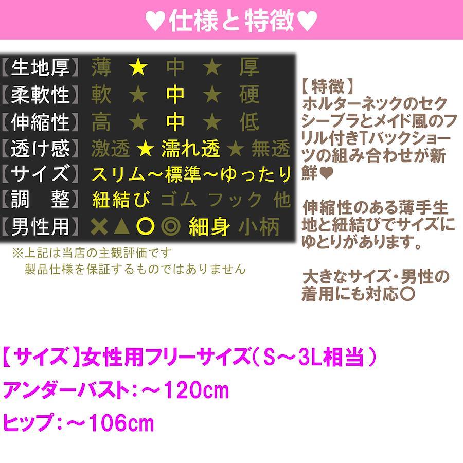 原産国 中国【商品内容】メイド風ブラジリアンビキニ 上下セット【サイズ】女性用フリーサイズ(S~3L相当)アンダーバスト:~120cm、ヒップ:~106cm【カラー】バリエーションあり。写真参照ください。【特徴】ホルターネックのセクシーブラとメイド風のフリル付きTバックショーツの組み合わせが新鮮?伸縮性のある薄手生地と紐結びでサイズにゆとりがあります。大きなサイズ・男性の着用にも対応〇(#lf)(#lf)(#lf)商品購入前に、ストア紹介ページをご確認ください。