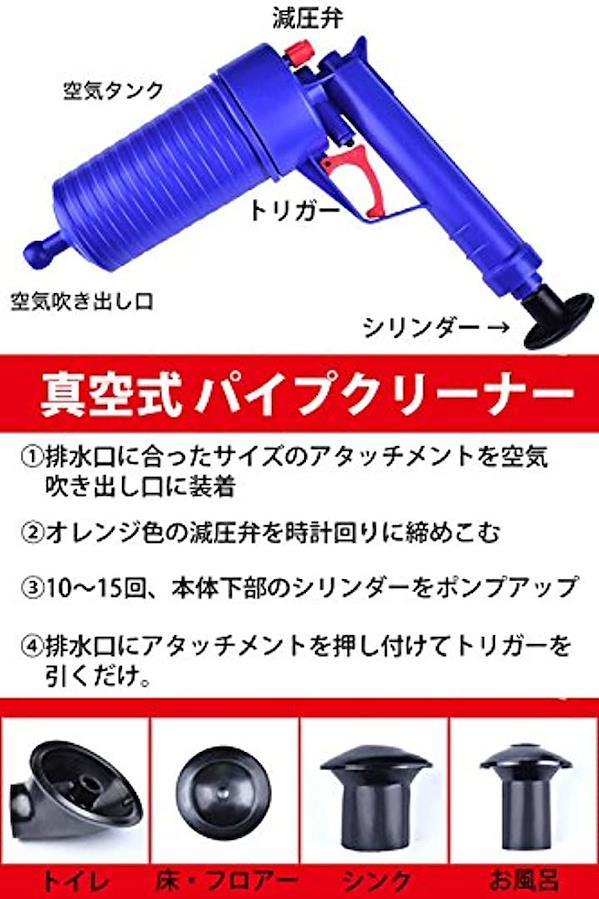 (1)排水口に合ったサイズのアタッチメントを装着 (2)オレンジ色の減圧弁を時計回りに締めこむ (3)10~15回、本体下部のシリンダーをポンプアップ (4)排水口にアタッチメントを押し付けてトリガーを引くだけ。