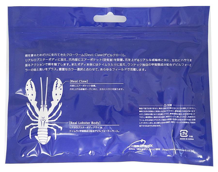 リアルロブスターボディに加え爪内部に空気室を設けリアルな威嚇感で蛸を魅了します。純正装備のケイムラ 入りに加えこのワームパックに限り味と匂いをプラス!!ワンナック独自の甲殻類成分配合デビルフォーミュラー入りとなっています。