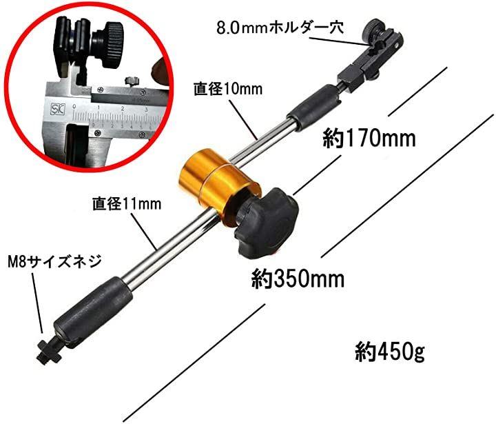 ・サイズ(約):全長350mm 重量450g アーム先端からロックノブ迄:170mm ロックノブからマグネット土台部分迄:140mm 測定器具取付穴径:8.0mm ヘッド素材:アルミ マグネット接続ネジサイズ: M8