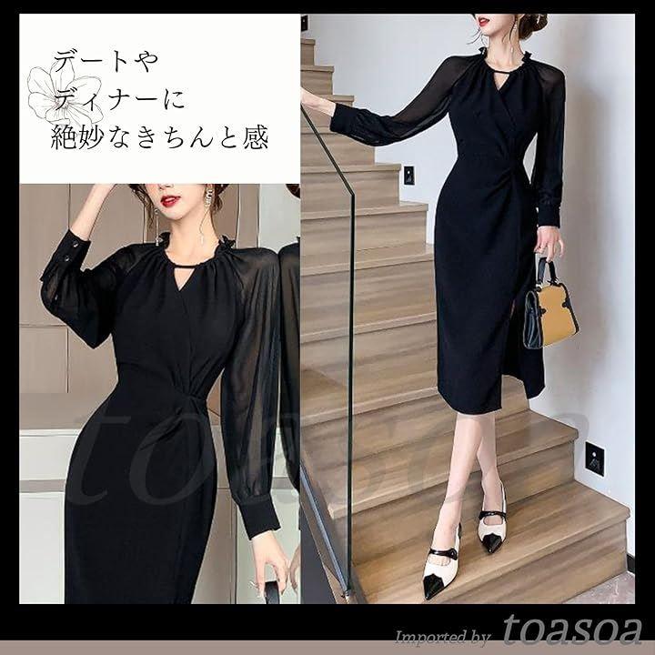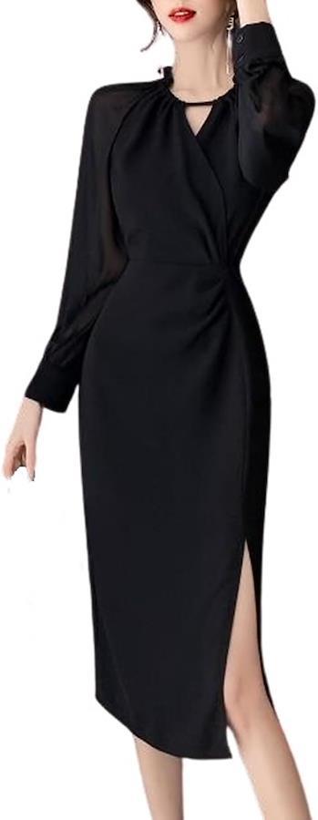 シックな雰囲気漂う長袖 タイト 膝下 ミモレ丈 ワンピース。