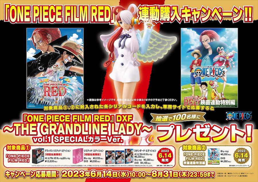 ●初回特典◆『ONE PIECE FILM RED』連動購入キャンペーン応募用シリアルコード※「ONE PIECE FILM RED」映画連動特別編Blu-ray、DVD封入のシリアルコードとあわせて専用サイトで応募すると、抽選で100名様に「『ONE PIECE FILM RED』DXF~THE GRANDLINE LADY~vol.1 SPECIALカラーVer.」が当たる!応募期間:2023年8月31日(木)23:59まで※初回特典は限定生産品です。在庫がなくなり次第、通常の仕様での販売となります。※応募期間中は必ず初回特典が封入されます。※商品に特典が適用される以前にご予約いただいた場合、特典が封入されます。※特典は数量限定により在庫が無くなり次第終了します。※原則、発売日までに予約購入されたご注文に特典が封入されます。在庫状況によって、発売日以降も特典付き商品が発送されることがあります。※特典はが販売、発送する商品に数量限定で封入されます。マーケットプレイスの出品者が販売、発送する商品の場合、出品者からのコメントをご確認の上でご注文ください。注意:初回特典付き商品のお取り扱いを終了いたしました。【解説】赤髪が導く“終焉”ルフィ、ウタ、シャンクス3人の過去が明らかになり――動き出す、歌と家族の物語。国内動員1474万人、興収203億円突破!!日本歴代興行収入ランキングTOP10入り!!!『ONE PIECE』シリーズ歴代興行収入、堂々の第1位!!2022年国内興行収入ナンバーワン、驚異の大ヒットを記録した劇場版『ONE PIECE FILM RED』が、Blu-ray&DVD化!1997年より「週刊少年ジャンプ」にて連載開始した『ONE PIECE』。2022年、単行本は“100巻”の大台に乗り、全世界累計発行部数は“5億部”を超え、テレビアニメも“1000話”を突破。漫画・アニメともに金字塔をうち立て続け、2022年7月、連載開始“25周年”に突入。そのアニバーサリーイヤーにふさわしく、『ONE PIECE FILM RED』は総合プロデューサー:尾田栄一郎で贈る劇場最新作。谷口悟朗(「コードギアス」シリーズ)を監督に迎え本作のオリジナルキャラクター・ウタをボイスキャスト・名塚佳織、歌唱キャスト・AdoのWキャストで担い、ウタとシャ