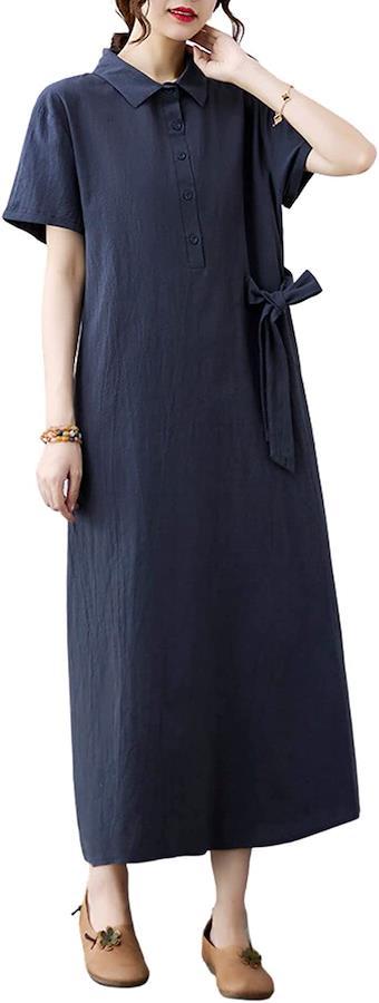 襟付きの上品で落ち着いた印象を与えるかわいい半袖夏ワンピが新登場。こなれ感のある着こなしをかなえるロング丈ワンピース*ややゆったりしたサイズのデザインで、華奢見え効果に期待。