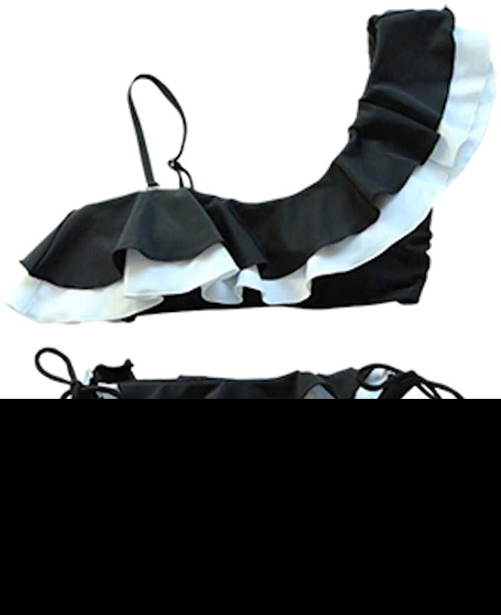 大きめのフリルを全体にあしらい、サイドには紐の凝ったディテール。