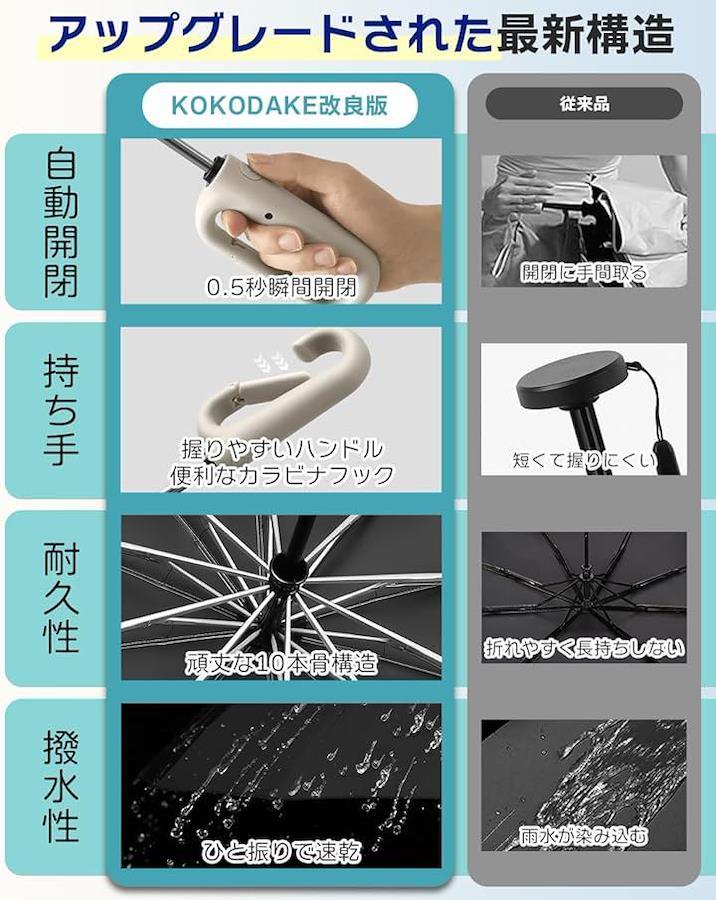 しかし、KOKODAKEの逆折り式ハイスペック傘は、アルミ合金とグラスファイバーを使用した10本骨構造により、軽さと強度の両立を実現しました。