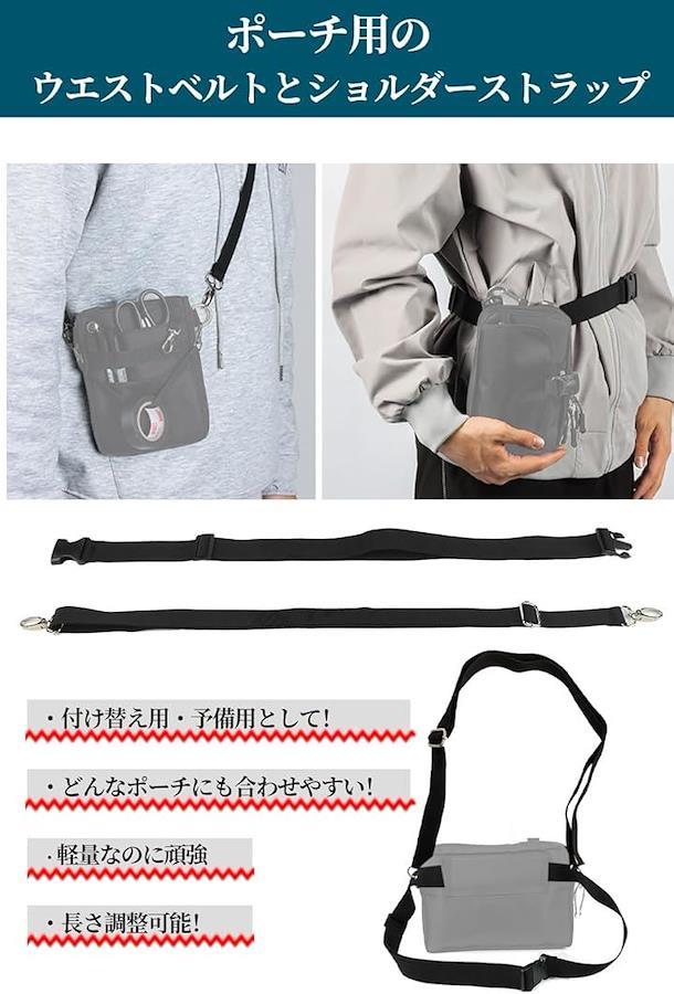 *注意*:スマホポーチ、ナースポーチ、内容量3L程度の小型水筒など比較的軽量のポーチ・バッグをぶら下げるためのウエストベルトとショルダーストラップのため、5kg以上の重い道具・工具を入れるバッグなどには適していません。