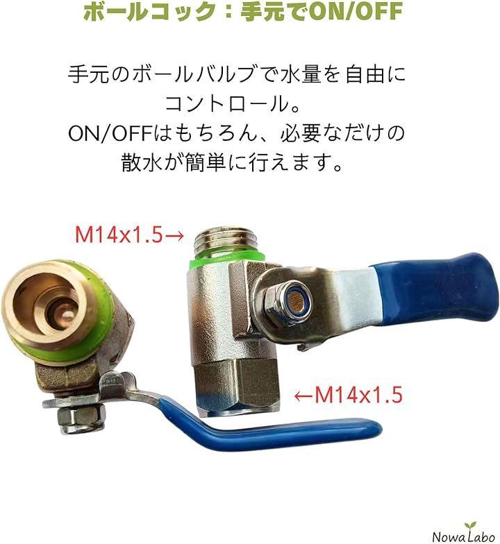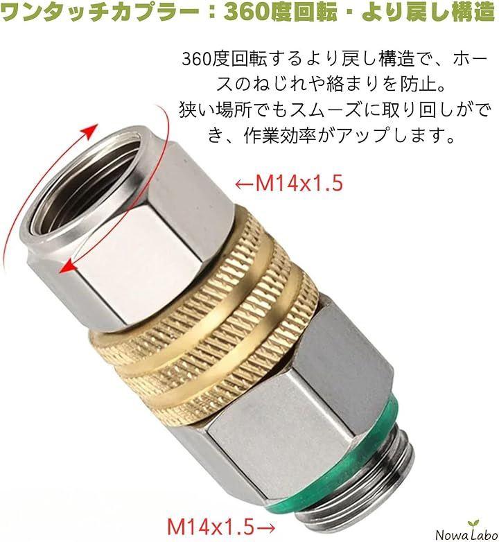 「ワンタッチ着脱で作業効率アップ」 M14x1.5メスネジに対応し、ノズルの接続・取り外しが片手でスムーズ。