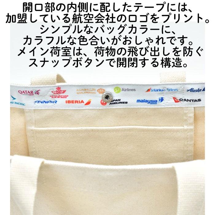 開口部の内側に配したテープには、加盟している航空会社のロゴをプリント。シンプルなバッグカラーに、カラフルな色合いがおしゃれです。メイン荷室は、荷物の飛び出しを防ぐスナップボタンで開閉する構造。コンパクトサイズでありながらマチ幅が12cmと収納力も高めに作られています。旅に、ふだん使いに、重宝しそうなエコバックです。