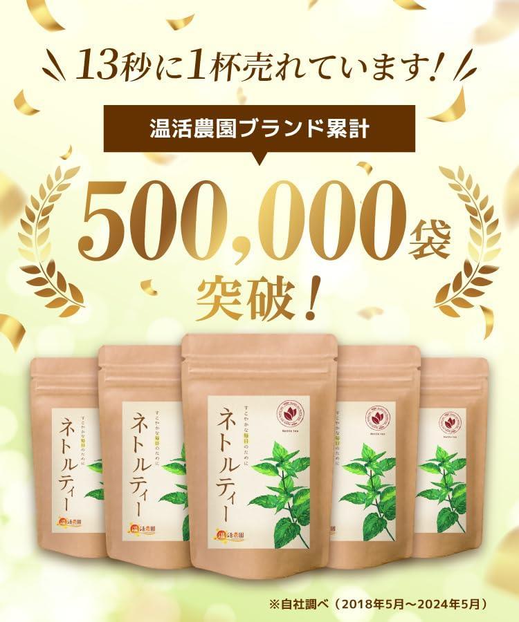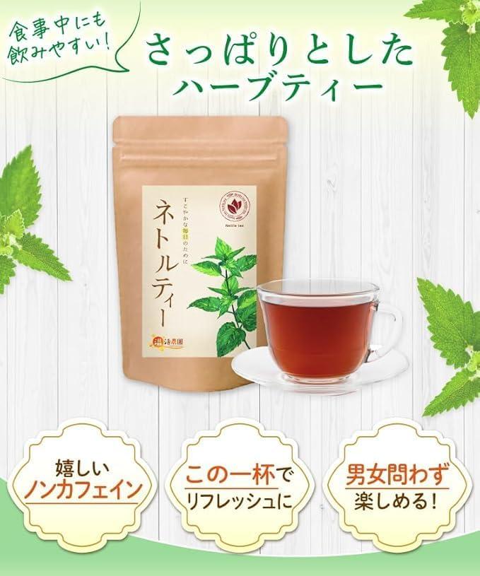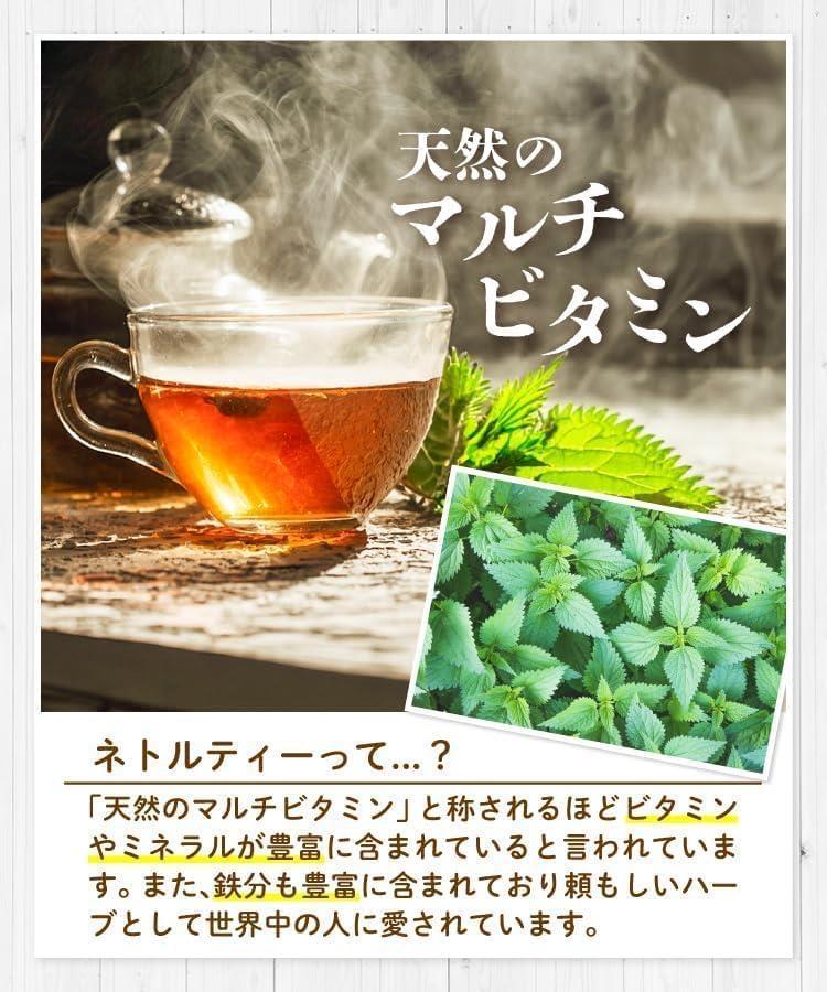 【500,000人以上のお客様から選ばれ続けています】私たちの健康茶は、素材選びから製造まで徹底したこだわりをもって作られています。その結果、多くの方に支持され、累計販売数が500,000袋を突破しました!【12,000件以上のレビューに心から感謝いたします】私たちの健康茶は、これまで多くのお客様にご愛顧いただき、たくさんのご感想や応援の声をいただきました。その数は累計12,000件を超え、ひとつひとつが私たちの励みになっています!【飲むたびにホッとする、やさしい時間をお届けします】どなたでも気軽に続けられるように、飲みやすさに徹底的にこだわりました。また、定期的に専門機関にて残留農薬検査などを行っており、やさしさと安心をお届けします。【名称】 ネトルティー【原材料名】ネトル【原料原産地名】スペイン【内容量】1.5g×30包【賞味期限と保存方法】製造日から2年 直射日光、高温多湿を避け保存してください。【お召し上がり方】ティーバッグ1包をカップに入れ、沸騰したお湯(150~200ml程度)を注ぎ、約3分程度おいてください。ティーバッグを湿らすようにお湯を注ぐとより一層香りと深みをお楽しみいただけます。【免責事項】メーカーによる商品リニューアルに伴いパッケージ(内容量も含む)変更が行われた場合、新パッケージでお届け致します事ご了承願います。