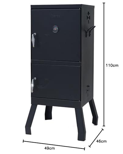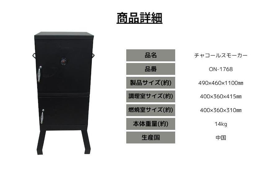 本体サイズ:49 x 46 x 110cm重量:14kg材質:スチール調理室サイズ:幅40x奥行36x高さ41.5cm調理室内高さ:クッキング網2枚付属、高さ約9cmピッチで3段階調節可能調理室内クッキング網有効寸法:30 x 30cm燃焼室サイズ:幅40x奥行36x高さ31cm脚部高さ:23.5cm付属品:金属製S字フック3個、クッキング網2枚、炭受け、ウォーターパン、庫内温度計製品仕様:脚部取付式