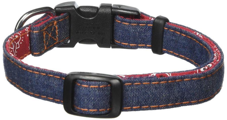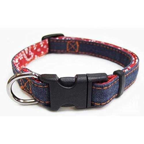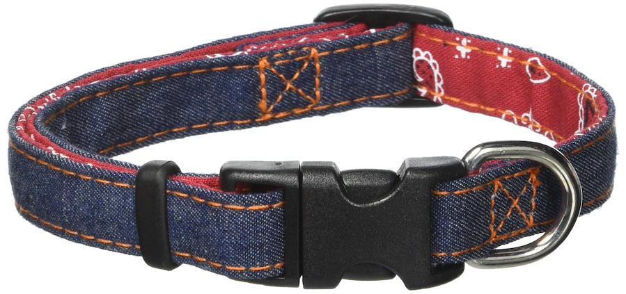 表面はデニム生地で、裏面にはペイズリー柄のコットン製生地を使用。柔らかく被毛にも優しいワンタッチバックルの首輪です。