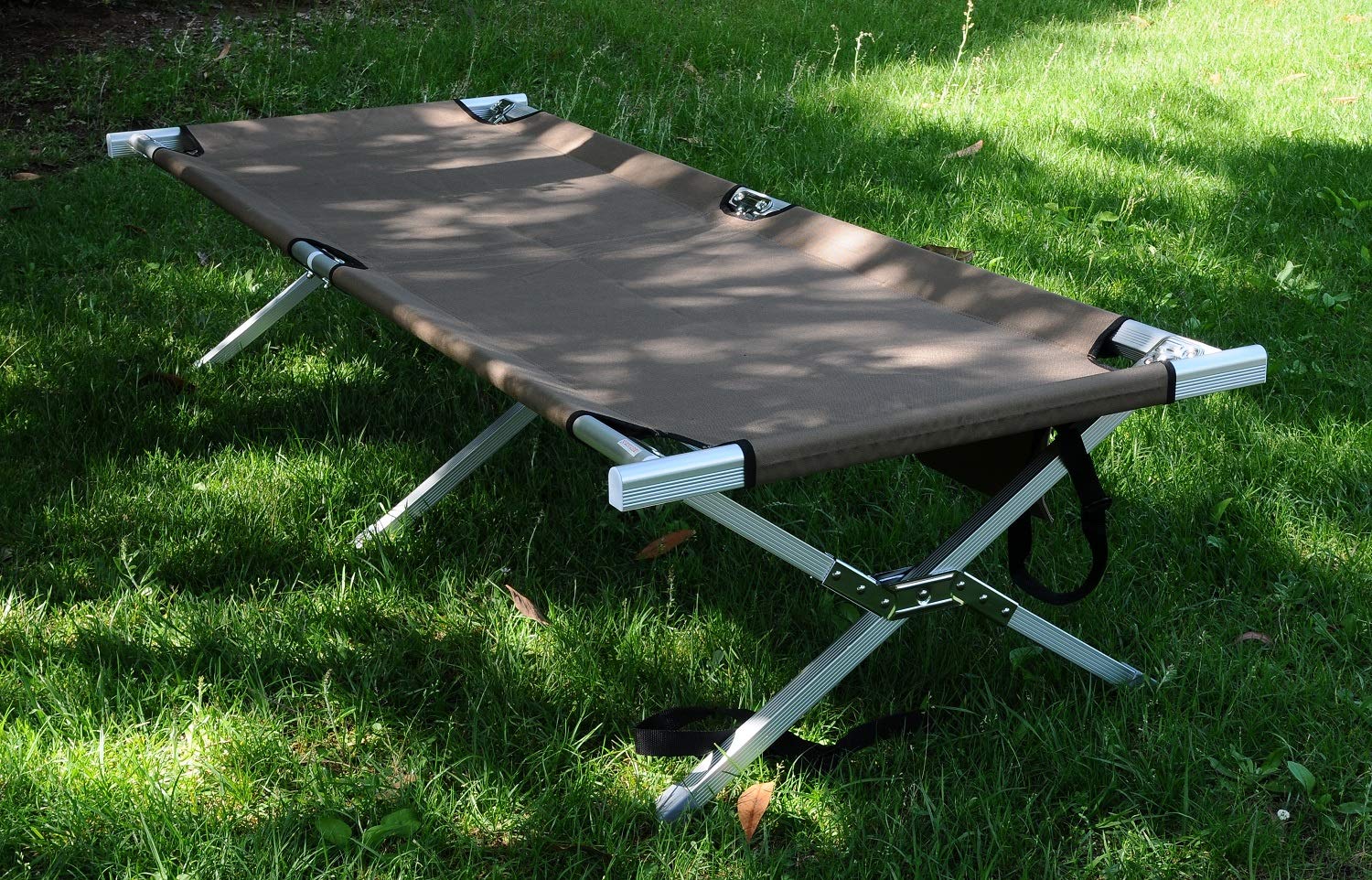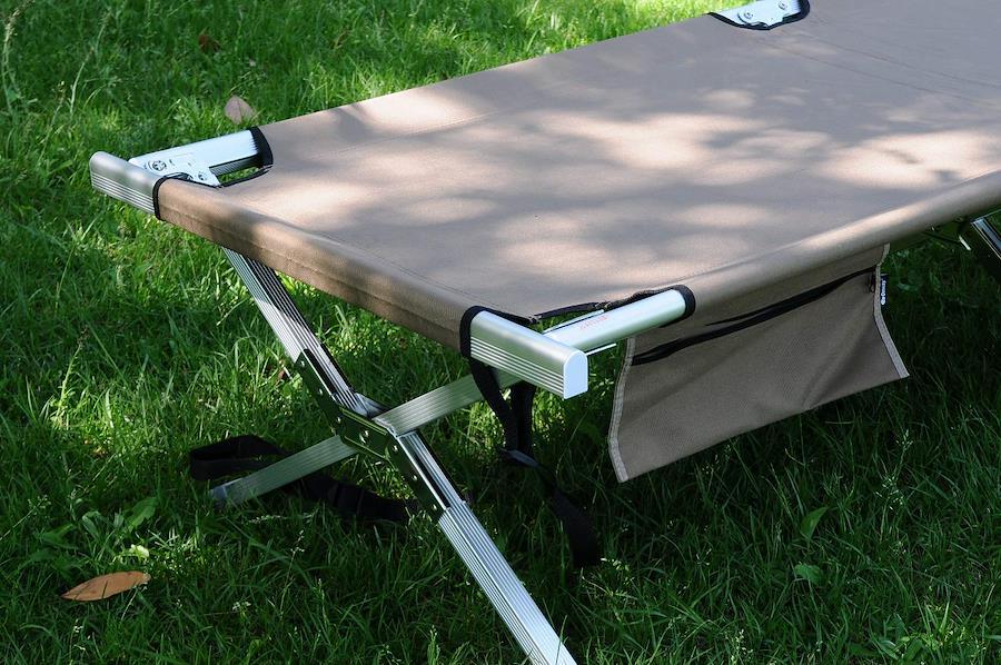 防災にも活躍、強いフレームの簡易ベッド。ベルクロでシート張りの強さを調節可能。リラックスしてお休みいただけます。携帯電話などの小物を入れるポケットもついて外でも安心。折りたたみは簡単でコンパクト。収納袋付きですので、どこへでも持ち運びが可能です。