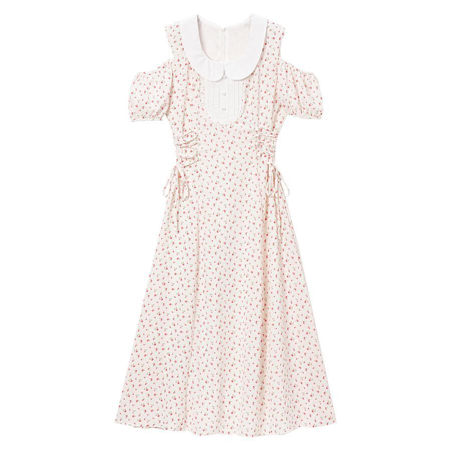オープンショルダーであざと可愛い肌見せが叶うワンピース【デザイン】部分開きや女性らしさを強調するパフスリーブなど、レディな要素をふんだんに詰め込んだアイテム。主張しすぎない小花柄はさりげなく華やかさを演出してくれます。とろんとしたフレアシルエットで着心地も良く、写真映えするのでデートや旅行など特別な日の一着としてもぴったり!両サイドに施したレースアップはご自身で調節できるのでコルセットのようにウエストをきゅっと細く見せたり、ゆったり着たい方にもおすすめです。【素材】さらっとしていて柔らかく、涼しげな素材です。《透け感》カラーによってあり 《生地の厚さ》普通 《裏地》あり 《伸縮性》なし《生産国》中国