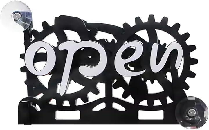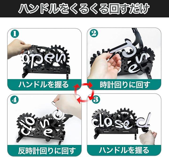 ハンドルをくるくる回すだけ。ギアを使ったからくり式で切り替えも簡単で楽しい。ユニークなオープンクローズ看板です。