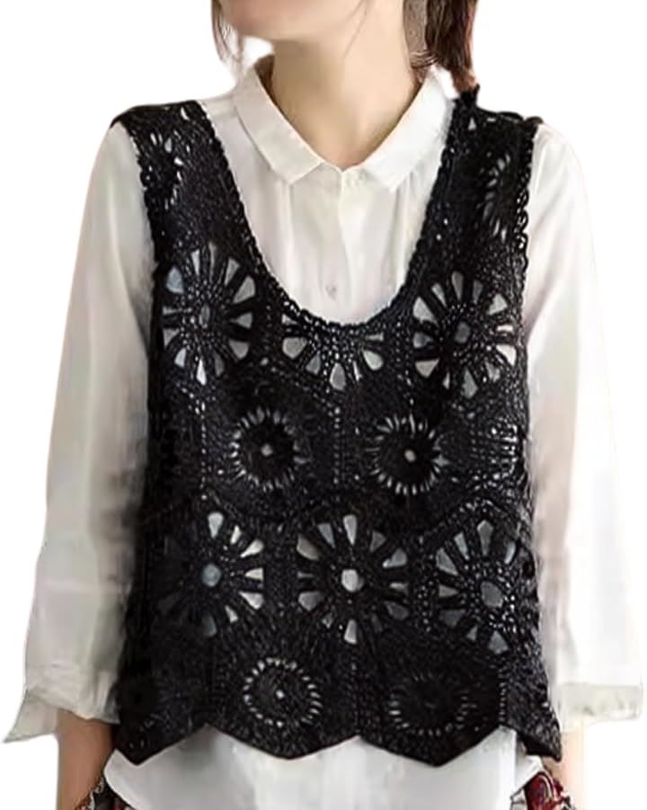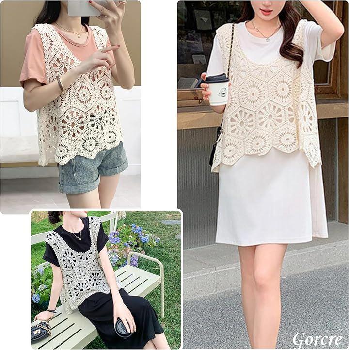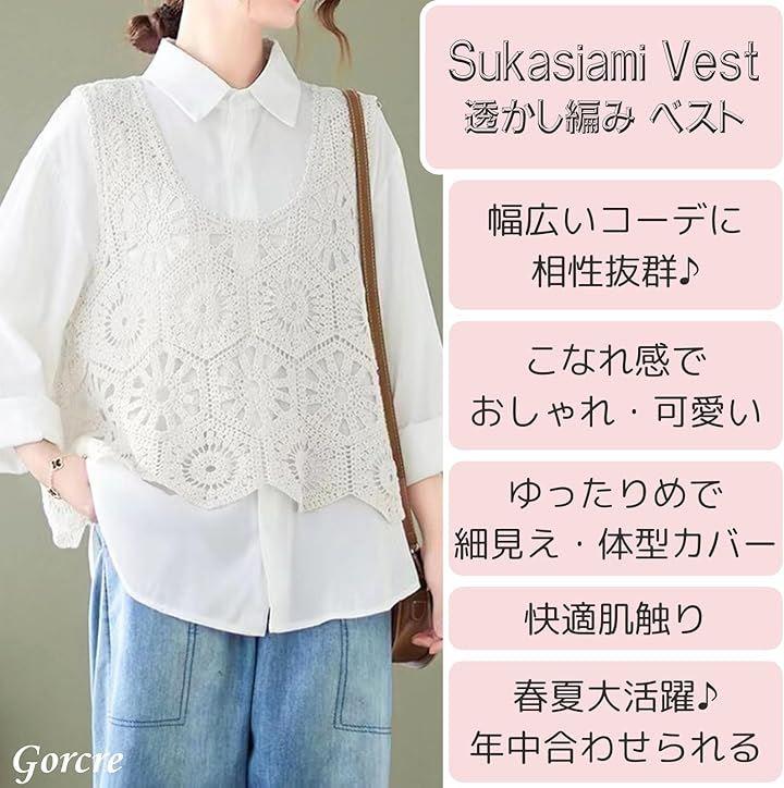 透かし編みの柄が、お洒落で可愛い、ニットベストのお届けです。春夏大活躍で、それ以外の季節も重ね着でおすすめです。