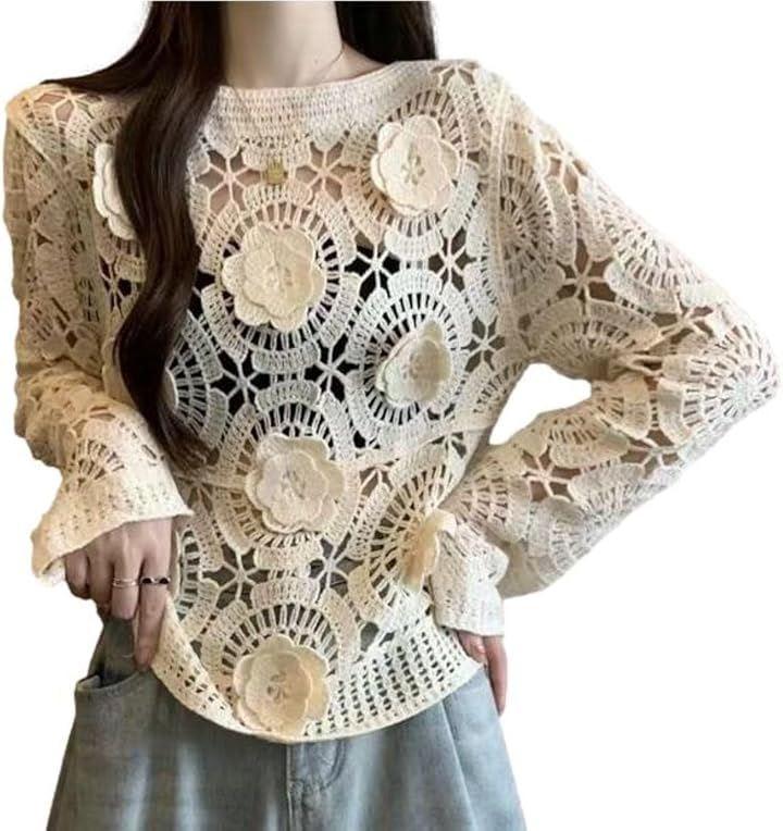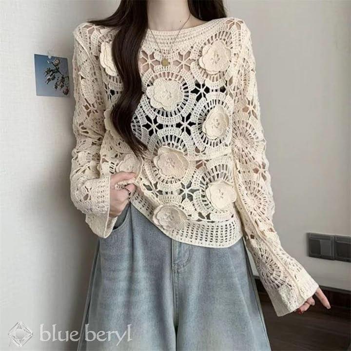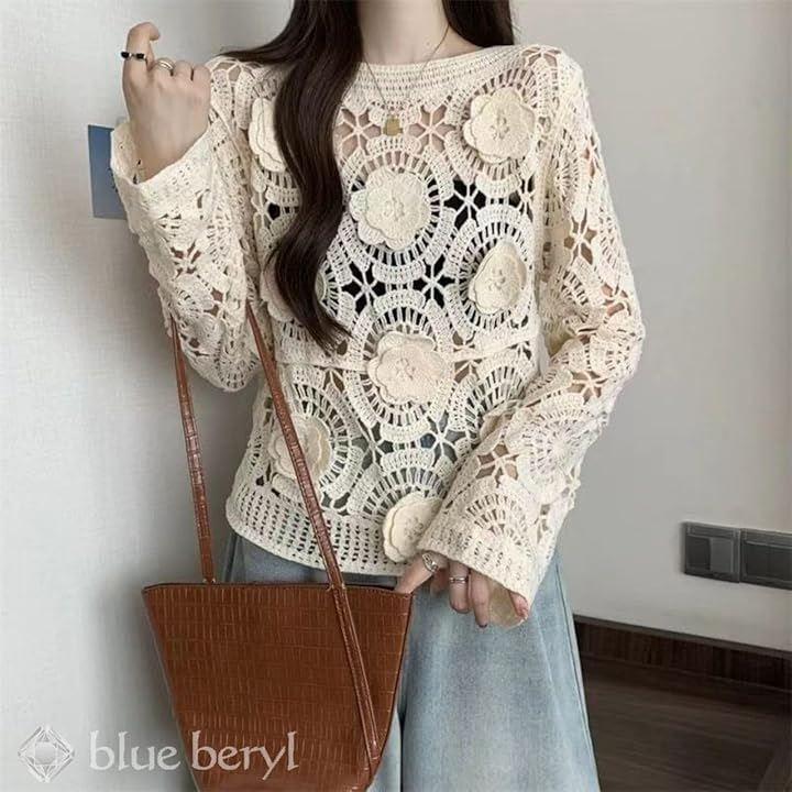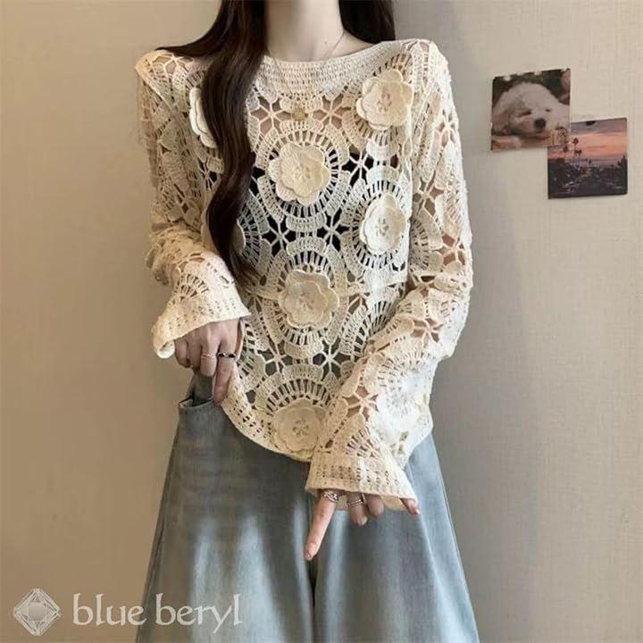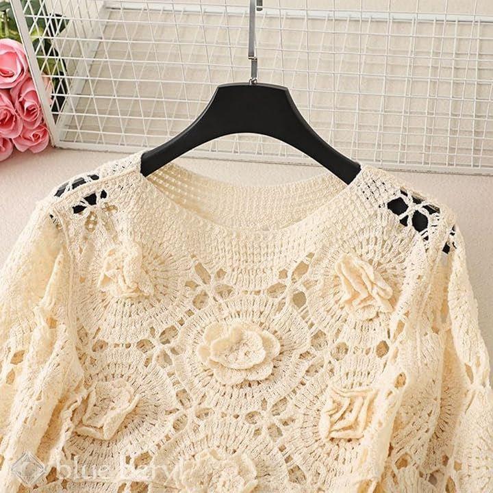 Blue Beryl Women's Openwork Lace Pullover with Circle Lace, Long and Flared Sleeves, Layered, Loose Silhouette, Feminine, and Slender Look for Taller Women