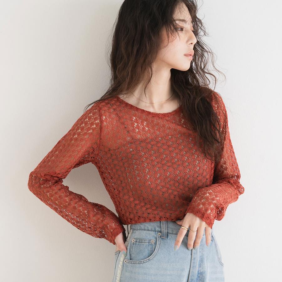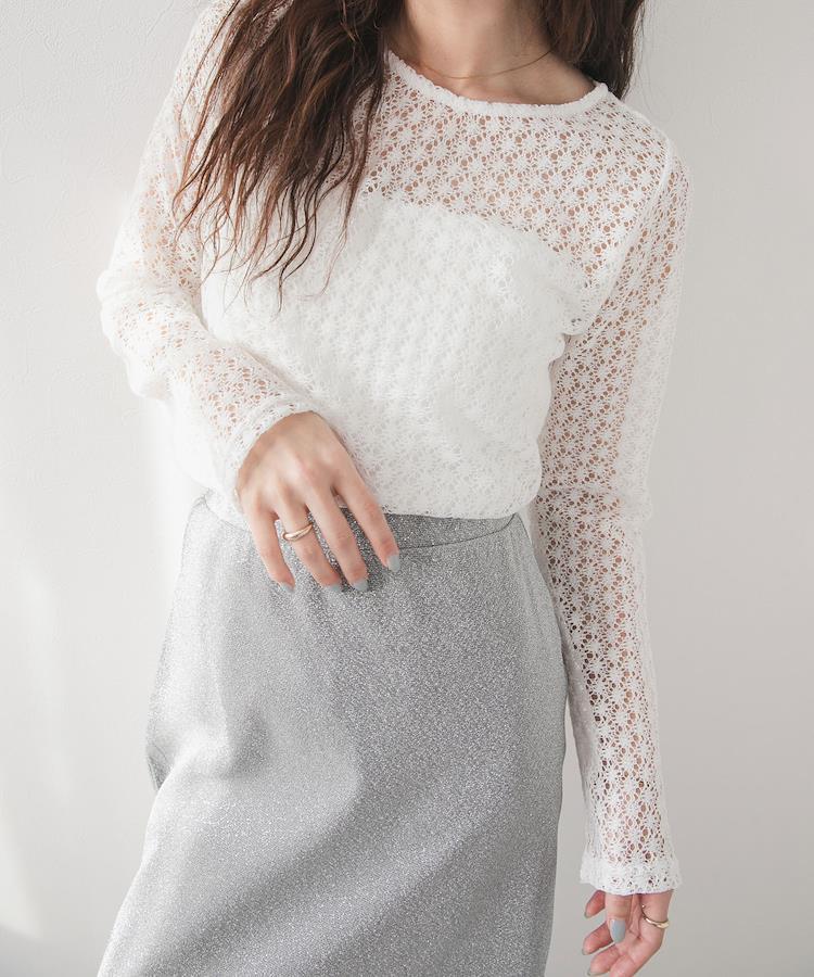 上品な透け感が魅力的。トレンド感たっぷりの透かし編みシアートップス