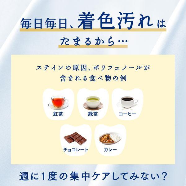 【ご注意】・発疹、かゆみ等が現れた場合は使用を中止し、医師に相談する。・目に入った時は、こすらずすぐに水で充分洗い流す。・本品は歯の表面に付着した着色汚れを落とすものです。