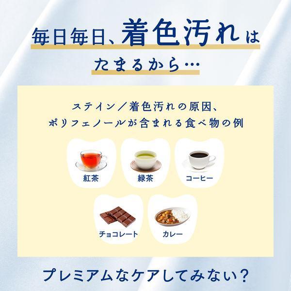 着色汚れ(ステイン)を除去して白い歯とツヤを叶える。●ステインコントロール成分:着色汚れ(ステイン)に染み込み、溶かし出す。●シャイニーホワイト成分:清掃剤とともに着色汚れ(ステイン)を効果的に落とし、白くツヤのある歯に。シャリッとした使用感。●ビタミンE配合。●フッ素:歯の表面のキメを整えて、歯質を強化し、ムシ歯を防ぎます。●IMP:原因菌を殺菌し、口臭を防ぎます。●PEG:タバコのヤニを溶解します。●アロマティックミント:南フランス産ラベンダーエッセンス(香料)配合、心地よく安らぐ香り。