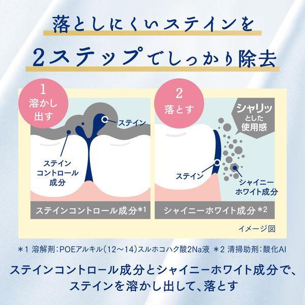 着色汚れ(ステイン)を除去して白い歯とツヤを叶える。●ステインコントロール成分:着色汚れ(ステイン)に染み込み、溶かし出す。●シャイニーホワイト成分:清掃剤とともに着色汚れ(ステイン)を効果的に落とし、白くツヤのある歯に。シャリッとした使用感。●ビタミンE配合。●フッ素:歯の表面のキメを整えて、歯質を強化し、ムシ歯を防ぎます。●IMP:原因菌を殺菌し、口臭を防ぎます。●PEG:タバコのヤニを溶解します。●プレミアムミント:16種類の天然成分(香料)配合、爽やかさ溢れる上質な香り。