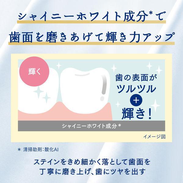 【ご注意】・発疹、かゆみ等が現れた場合は使用を中止し、医師に相談する。・目に入った時は、こすらずすぐに水で充分洗い流す。・歯みがき後、シャイニーホワイト成分の粒子が気になる場合は、お口をよくすすいでください。