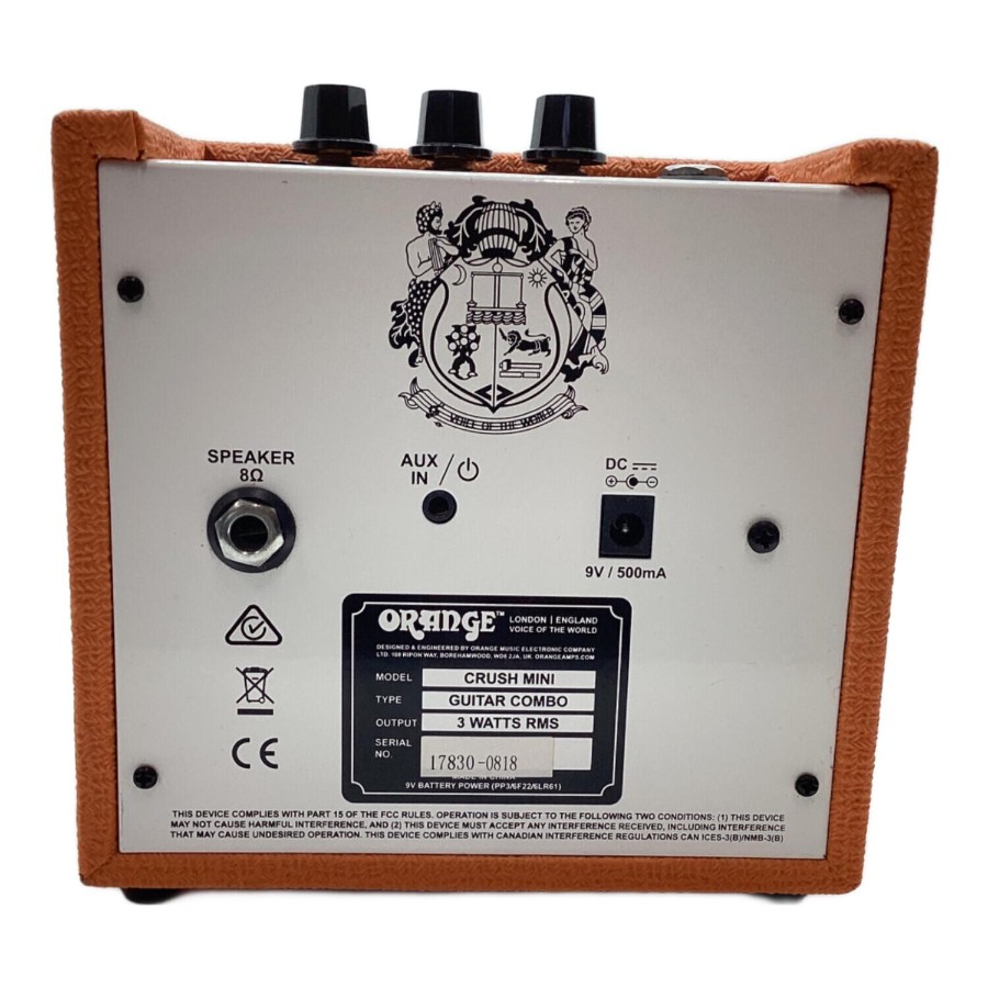 ■商品状態程度B:通常程度の使用感があるお品物こちらの商品は小キズやヨゴレ、若干の使用感などが見受けられます。また店頭にて展示販売を行っている為、記載に無いキズ、ヨゴレなどが見受けられる場合がございます。■商品説明ブランド:Orange (オレンジ)アイテム名:Crush Mini型番:CR-MINI製造国:中国 (China)チャンネル:1チャンネル(Gain, Shape, Volumeの3ノブ構成)出力:3Wスピーカー:4インチ Voice of the World スピーカー × 1エフェクト:なし(内蔵クロマチック・チューナー搭載)使用電源:9V乾電池(6F22)または 9V ACアダプター(センターマイナス)■付属品本体のみ■その他必ず、商品注文される前に店舗情報に記載している注意事項をご確認ください。