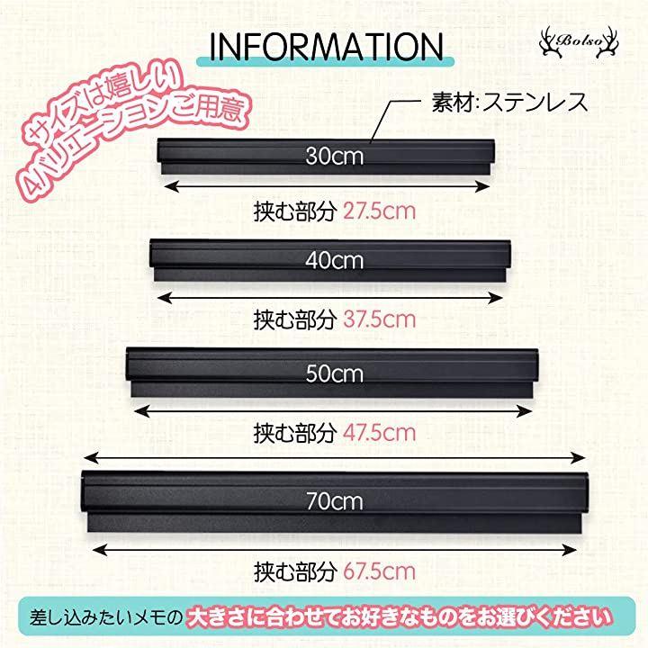 ・サイズは嬉しい4バリエーションをご用意。設置したい場所や差し込みたいメモの大きさに合わせてお好きなものをお選びいただけます。「カラー」ブラック「サイズ」30cm、40cm、50cm、70cm「素材」ステンレス