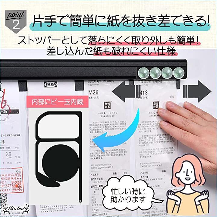 ・片手でサッと簡単に紙を抜き差しすることができます。内部にはビー玉が内蔵されているため、ストッパーとしての役割を果たし落ちにくい仕組みになっています。また、取り外しも簡単なため差し込んだ紙も破れにくい仕様になっています。