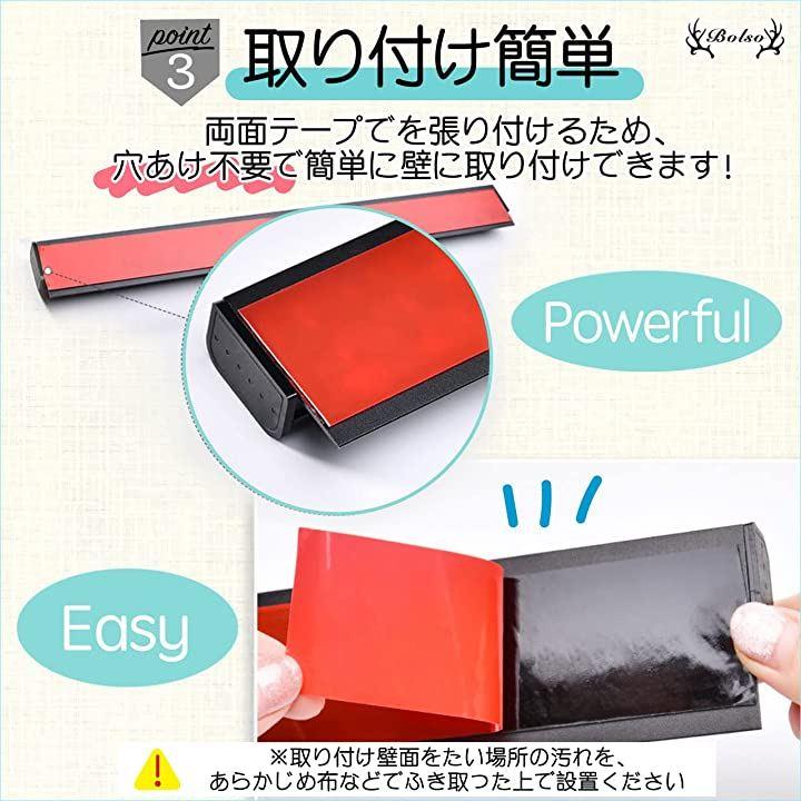 ・取り付けは簡単。両面テープで張り付けるため、穴あけ不要で簡単に壁に取り付けできます。*取り付ける壁面の汚れをあらかじめ布などでふき取った上で設置ください。