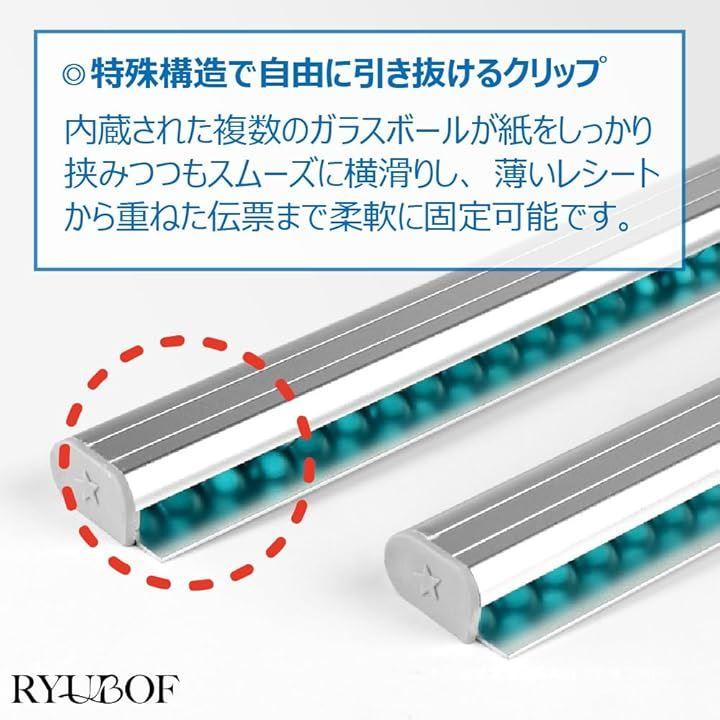 「特殊構造で自由に引き抜けるクリップ」内蔵された複数のガラスボールが紙をしっかり挟みつつもスムーズに横滑りし、薄いレシートから重ねた伝票まで柔軟に固定可能です。