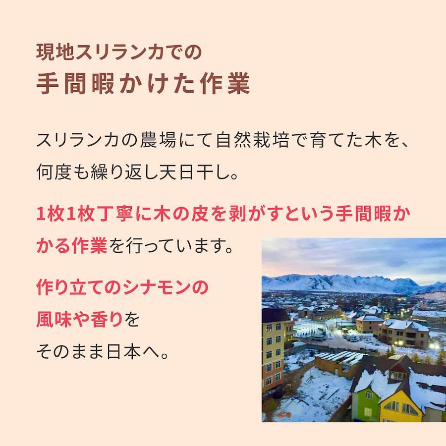 身体に取り入れるものだから、製造工程や生産工場にもこだわりました。原料は無農薬で有機JAS認定を受け、丁寧に栽培されたシナモンだけを使用。現地スリランカの農場にて、自然栽培で育て上げたシナモンの元となる木を、何度も天日干しし、それを一枚一枚丁寧に剥がすという手間暇かけた作業を行っています。作り立てのシナモンは、そのまま日本の製造工場へ送られ、有機JAS認定を受けた京都にある提携工場で厳しく検品。篩にかけたものだけを丁寧に袋詰めしております。提携工場は、有機JAS認定だけでなく国際認定であるSQF認証も取得しており、衛生管理や品質管理に徹底してこだわった環境下で製造しています。
