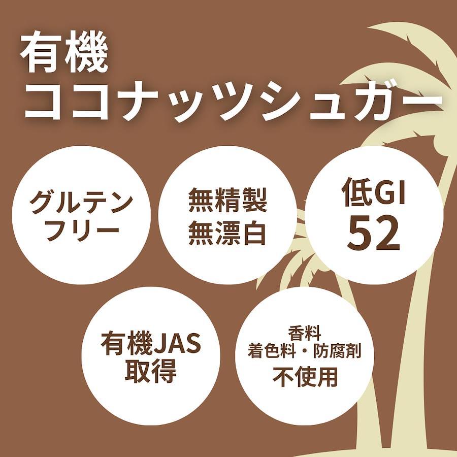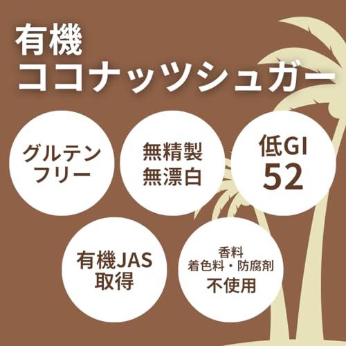 1お砂糖なのに低GIなのが特徴。お子様からお年寄りまで幅広く、安心してお召し上がりいただけます。また、カリウムや銅もバランス良く含んでおり、身体にうれしい食品です。 2有機JAS、その他世界基準の認証を取得。有機JASを取得したココナッツからシロップを採集。またオーガニック先進国アメリカでのUSDA ORGANICも取得しております。 3無添加・無漂白の伝統製法へのこだわり。有機栽培で育てたココナッツの花のつぼみの根本から採集された蜜を、中温でじっくり丁寧に煮詰めました。きび糖のような優しい甘さと、キャラメルバニラのよな香りがほのかに香ります。食べる人のことを考えたからこそ、無精製・無漂白にもこだわりました。 4きび糖のような優しい甘さとほのかに香るキャラメルのようなフレーバーが特徴です。料理・菓子・ジュース・スムージー作りやコーヒー、紅茶の甘味料としてお使いください。300mlの水にスプーン1杯溶いて、スポーツドリンクとしてお召し上がりいただくのもおすすめです。