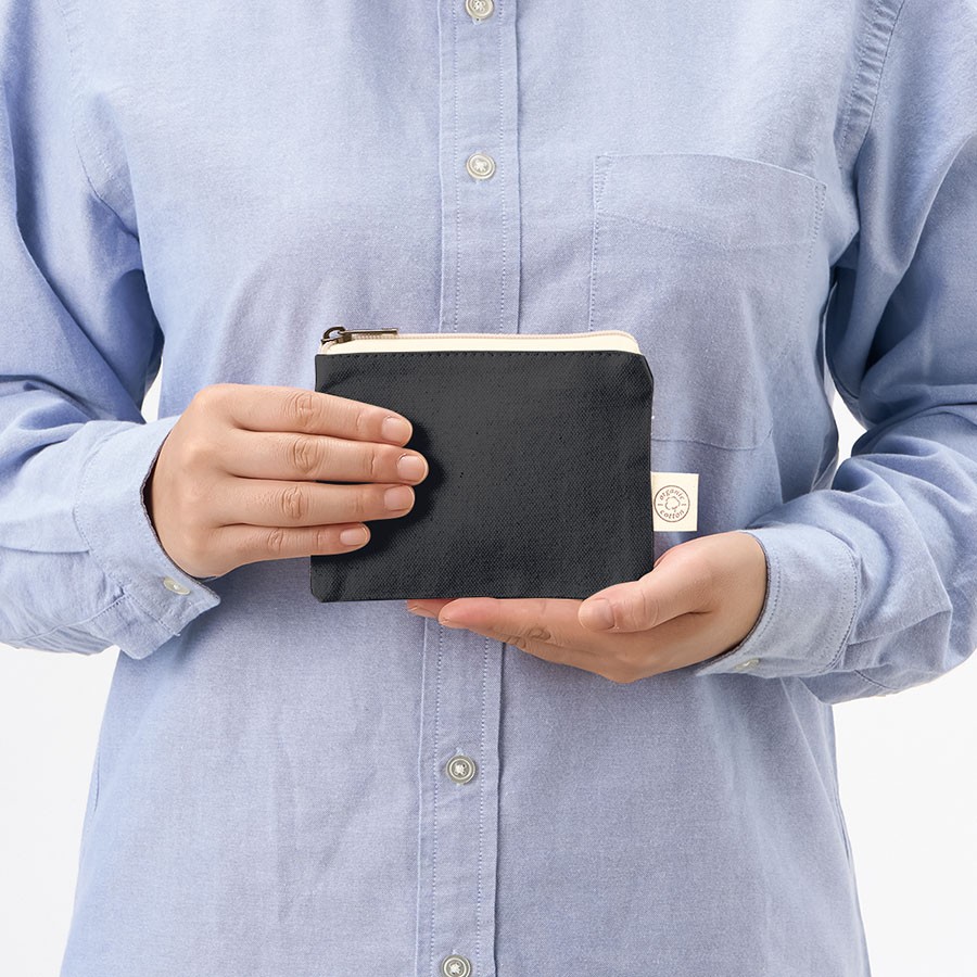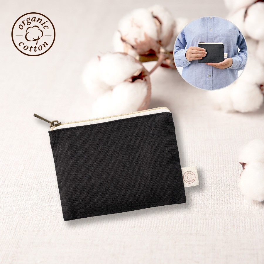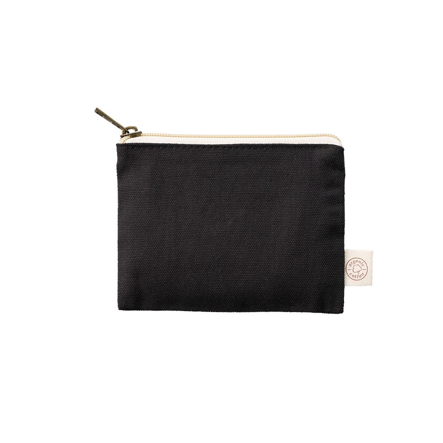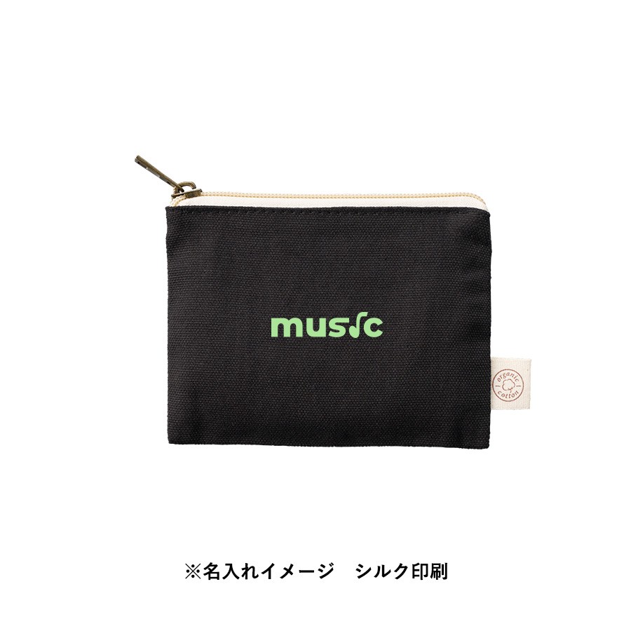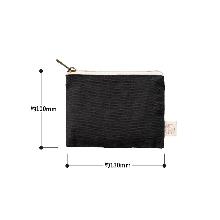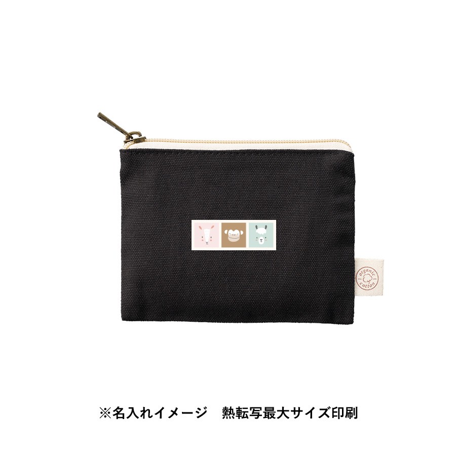 オーガニックコットンを使用したフラットポーチです。バッグに収納しやすいフラットな形かつ、シンプルなデザインなのでオリジナルロゴやキャラクターデザインなど名入れも映えます。また引手部分にはアンティークゴールドを使用し、高級感のある印象にしました。SS・S・Mサイズの3サイズで展開しており、SSサイズは小物入れとしてイヤホンやリップなどを入れて持ち歩くのにもぴったりです。単色印刷からフルカラー印刷まで可能なので、さまざまな案件に対応ができます。別ページで定番のナチュラルカラーの展開もございます。