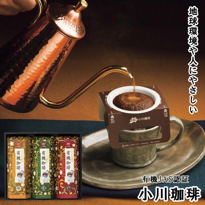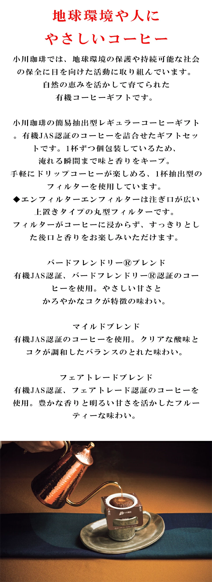 小川珈琲の簡易抽出型レギュラーコーヒーギフト。有機JAS認証のコーヒーを詰合せたギフトセットです。1杯ずつ個包装しているため、淹れる瞬間まで味と香りをキープ。手軽にドリップコーヒーが楽しめる、1杯抽出型のフィルターを使用しています。