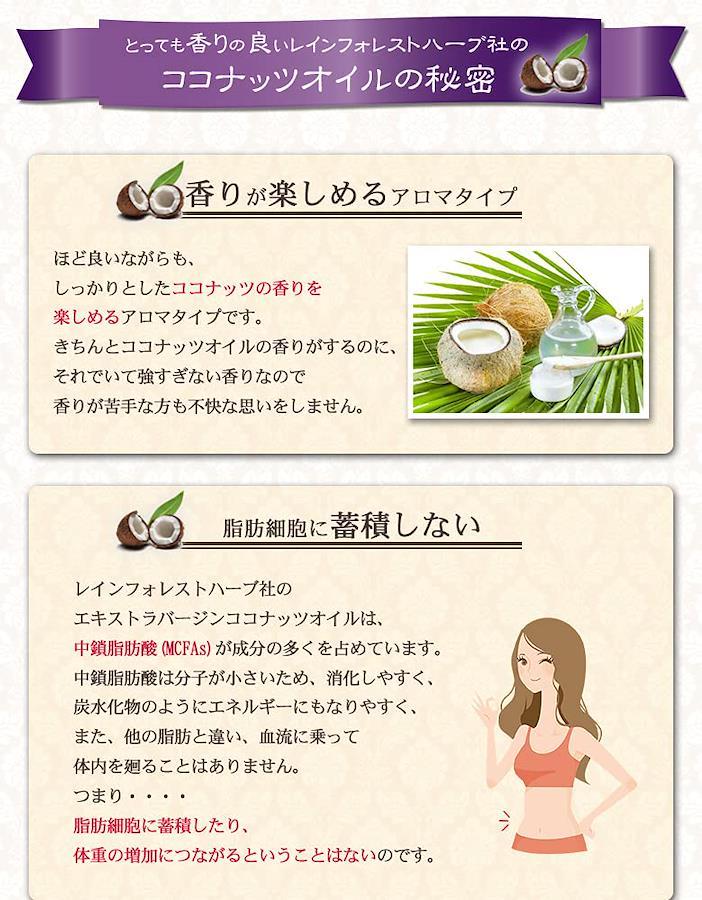 ほど良いながらも、しっかりとしたココナッツの香りを楽しめるアロマタイプです。そのままドレッシングやコーヒーに入れて使用して頂けますし、熱・光・酸素による酸化に強い中鎖脂肪酸が主成分ですので、安心して加熱調理にもご利用頂けます。 BPA(内分泌攪乱化学物質の懸念)を避けるためにプラスチック容器を使用しておりません。原料は 無添加 無精製 無漂白 無保存料です。