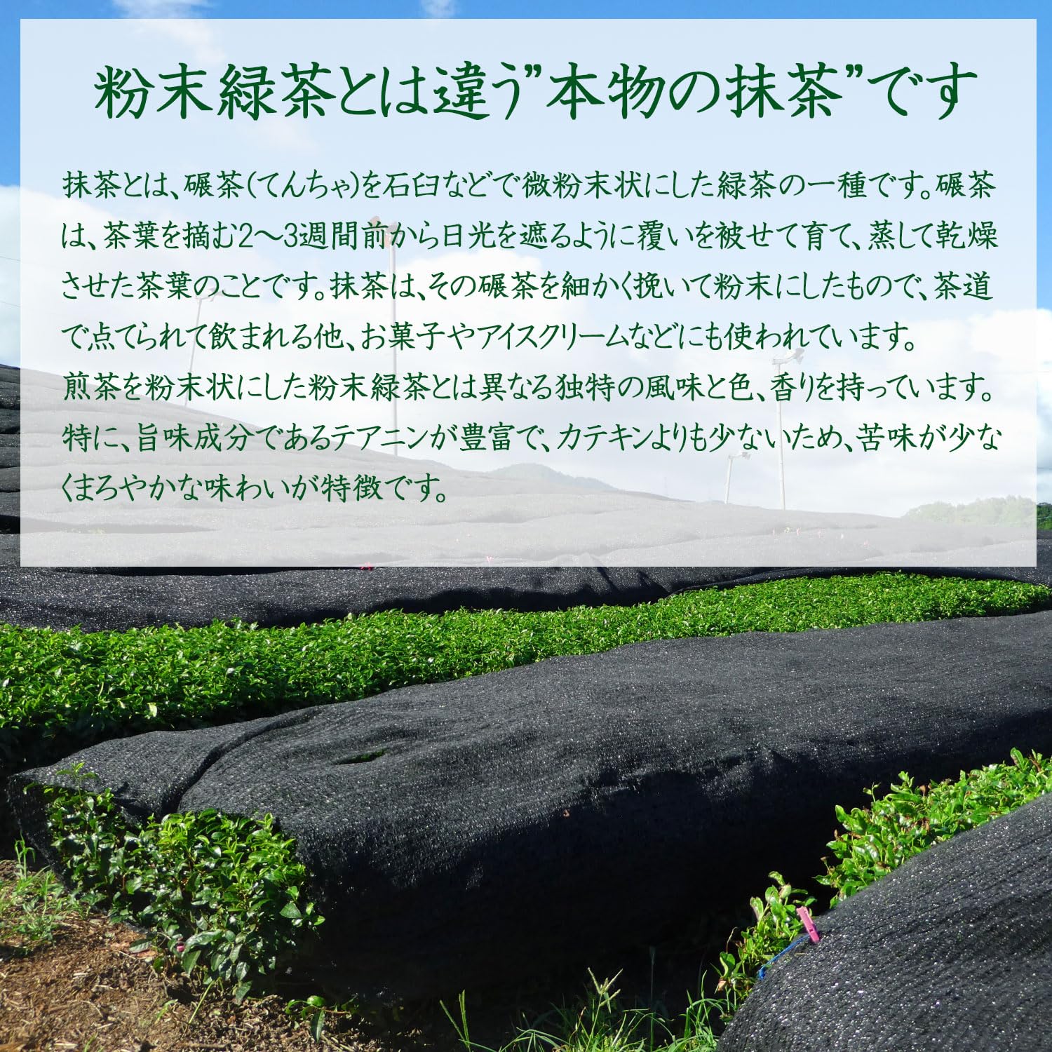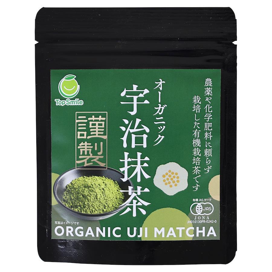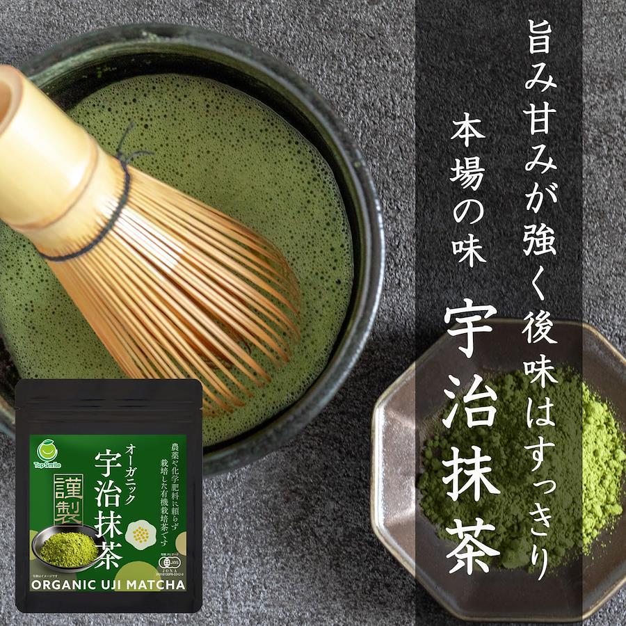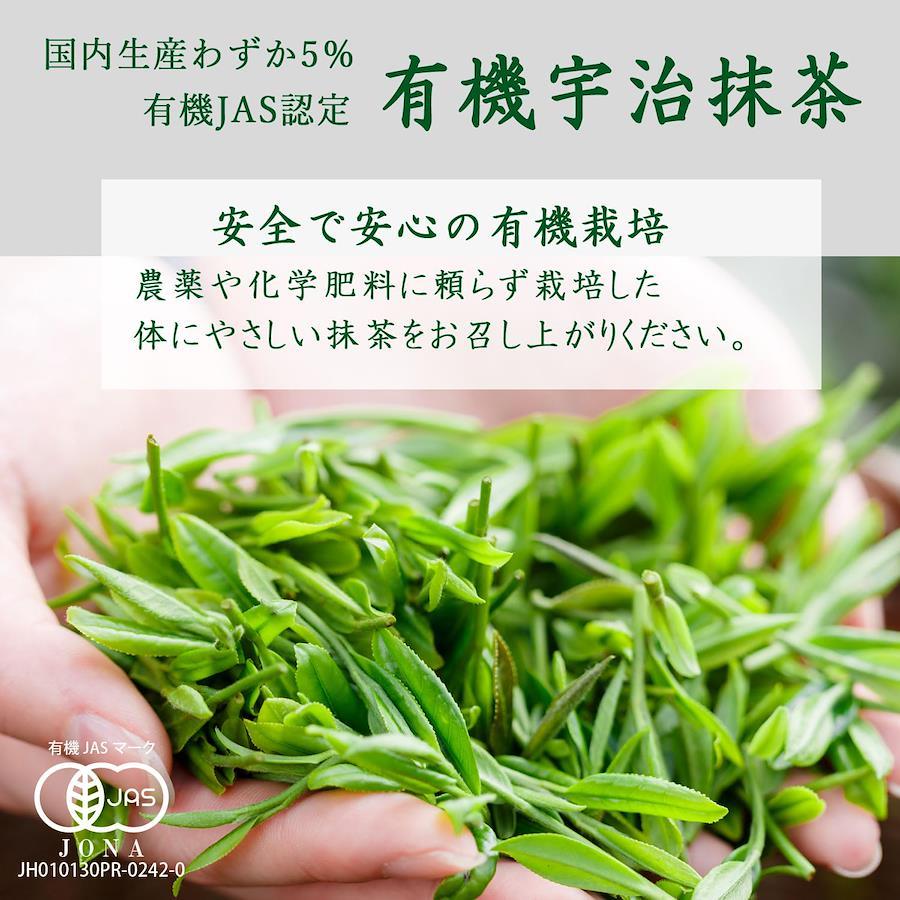 【一番摘み茶】春に育った新芽の葉だけを摘み取り、丁寧に挽き、色よく濃厚な味で香り豊かな有機宇治抹茶です。【手軽に本格抹茶が味わえる】茶葉に覆いを掛けて育て、炉で炙り碾茶を作り、これを挽いたものが抹茶になります。粉末茶や粉茶とは違う、色よく薫り高い味わいをお楽しみください。【無農薬・無化学肥料栽培】通常のお茶には殺虫剤や除草剤など100種類以上の農薬が使用されていると言われています。本商品は農薬や化学肥料に頼らず栽培したお茶です。【有機JASの認定】有機JAS法令で定められており、認定は民間の登録機関に委嘱され、その検査をクリアできた事業者のみ有機JASマークの表示が許されます。【茶せんで飲む】ティースプーン1杯(約1g)を茶碗に入れ、お湯(約50cc)を入れ泡がきめ細かく全体的に立つまで茶せんでかき混ぜてお召し上がりください。【急須で飲む】ティースプーン1杯(約1g)をカップに入れ、お湯(約100cc)を注ぎます。スプーンで良く混ぜてからお召し上がりください。【原材料】有機緑茶(京都府産)【保存方法】高温・多湿を避け移り香にご注意ください。|取扱上の注意:お茶葉鮮度が大切です。開封後はお早めにお飲みください。【免責事項】メーカーによる商品リニューアルに伴いパッケージ(内容量も含む)変更が行われた場合、新パッケージでお届け致します事ご了承願います。