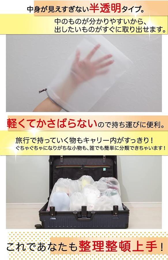 旅行で持っていく物もキャリー内がすっきり。 ぐちゃぐちゃになりがちな小物も、誰でも簡単に分類できちゃいます。 防水用の巾着袋。