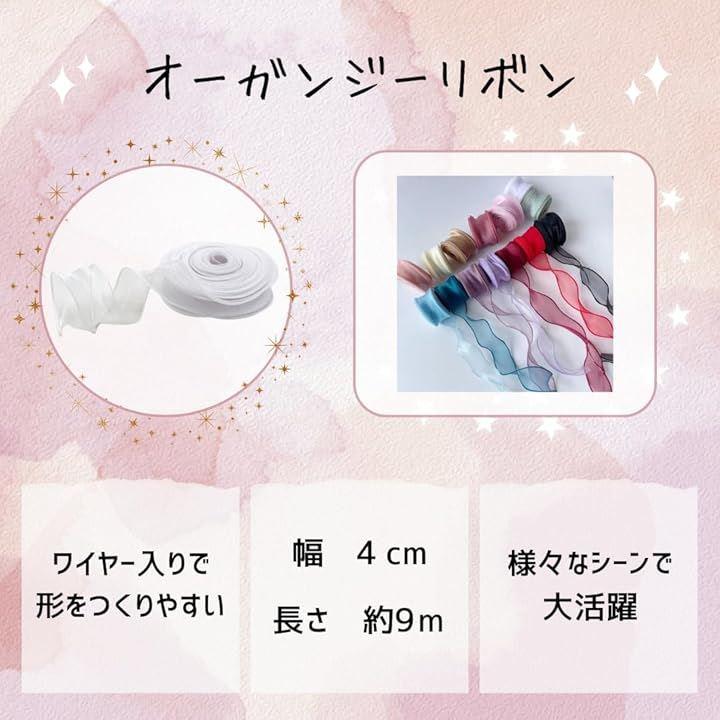 「KAZARI日和 オーガンジーリボン」は、幅4cm、長さ約9mのたっぷりサイズで、透け感が美しい高品質リボンです。