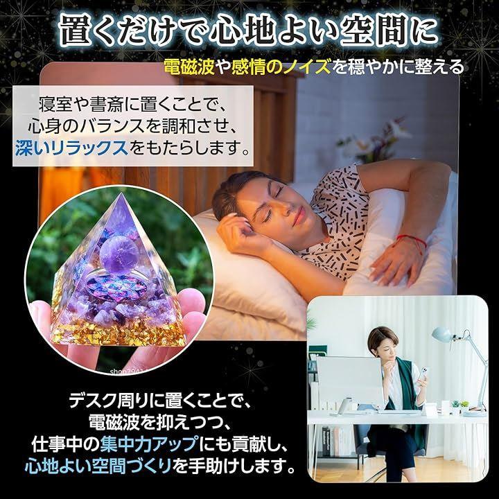輝くオルゴナイトピラミッドは、ポジティブなエネルギーの源として空間を調和させます。