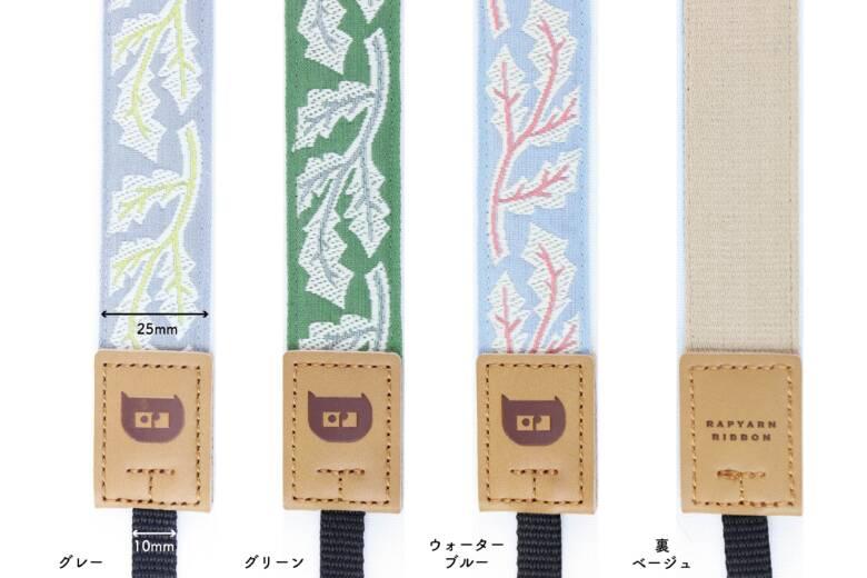 《葉っぱリボン グレー》シンプルだけど上品なグレーのカメラストラップ。どんな服装にも合います。《葉っぱリボングリーン》鮮やかなグリーンが特徴のカメラストラップ。シンプルな服装の差し色に鮮やかなグリーンはいかがでしょうか?《葉っぱリボンウォーターブルー》水に浮いた葉っぱを思い浮かばせるようなカメラストラップ。葉っぱのオレンジがポイント!
