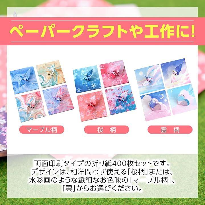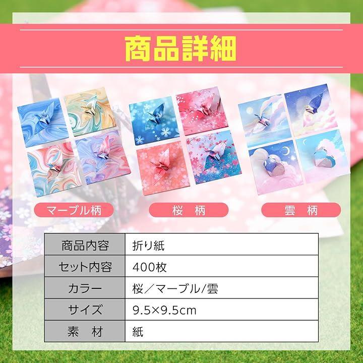 「商品内容」折り紙「セット内容」400枚「カラー」桜/マーブル/雲 「サイズ」9.5x9.5cm「素材」紙 *モニターの環境により、色の見え方に若干差が生じる場合がございます。