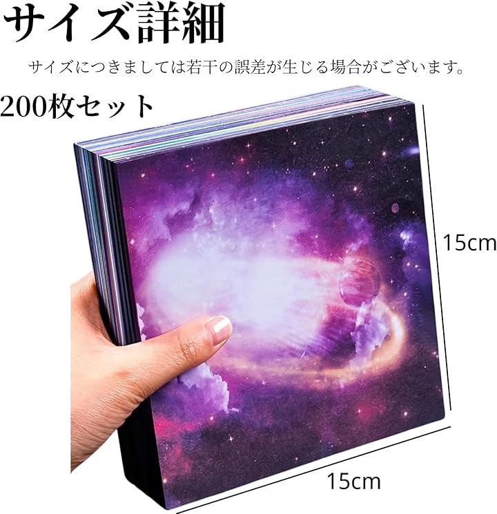 豊富なデザインで楽しめる大容量折り紙セット 本商品は、正方形15x15cmサイズの折り紙がたっぷり200枚入った大容量セットです。