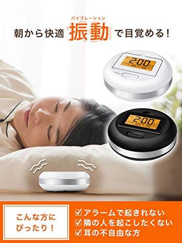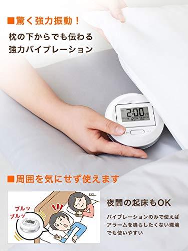 【強力バイブレーション機能】目覚まし時計に振動(バイブ)機能が加わった振動アラームクロック『ブルブル・クラッシュ』。アラーム時刻になると、スマートフォンのバイブレーションよりも何倍も強い振動によって起こしてくれます。枕の下に置いてもしっかりと伝わるほどの振動です。大音量の目覚まし時計が苦手な方も朝から快適な気持ちで一日を迎えることができます。 【こんな方におすすめ】アラーム音だけでは起きれない、同室にいる家族や隣の人を起こしたくない、耳の不自由な方に最適な時計です。アラームは3つのモード(音、振動、音+振動)で切り替えができ、自分の使用目的に合わせて使うことが可能です。本体サイズが小さいので、出張先や旅行などへ持って行って使うのも便利です。 【枕の下に入れて使う】主にバイブレーション機能を使いたい時は枕の下に入れて使います。設定した時刻になるとブルッブルッと震えて起こしてくれます。コンパクト設計なので浮き出たり、寝ている時も不快感がありません。寝相によってズレないように本体裏側にはシリコンゴム脚になっています。 【多機能】毎日快適に起きれるように豊富な機能が備わっています。3つのモード切替(アラーム、バイブ、アラーム+バイブ)や二度寝防止のスヌーズ機能、夜間でも表示が見やすいオレンジ色のバックライト液晶など便利な機能がいっぱい。2つの時刻を設定できるダブルアラームは平日や休日など起きる時間を変えたい時に役立ちます。 【置き時計としても使えます】表示部分を立てると置き時計として使うことができます。時刻を確認したい時や枕の下に入れたくない方やベッドサイドに置きたい方でも使いやすいです。単3形乾電池2本で使えるので手軽に使えます。