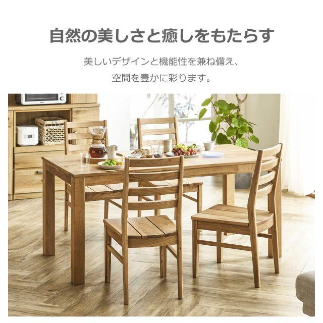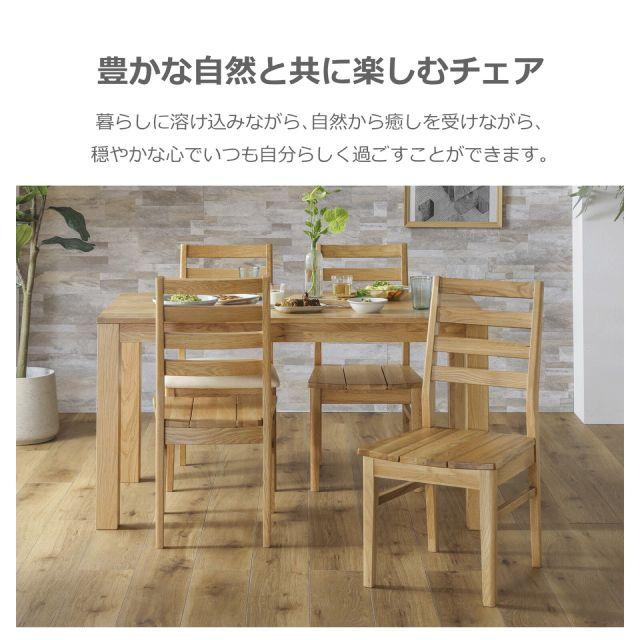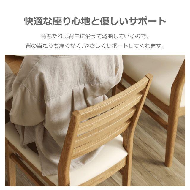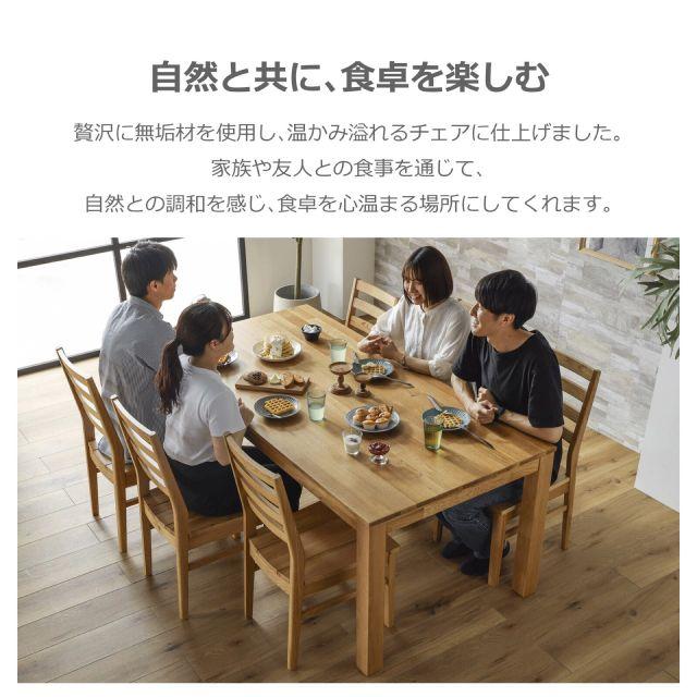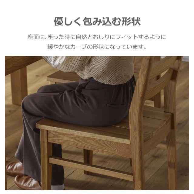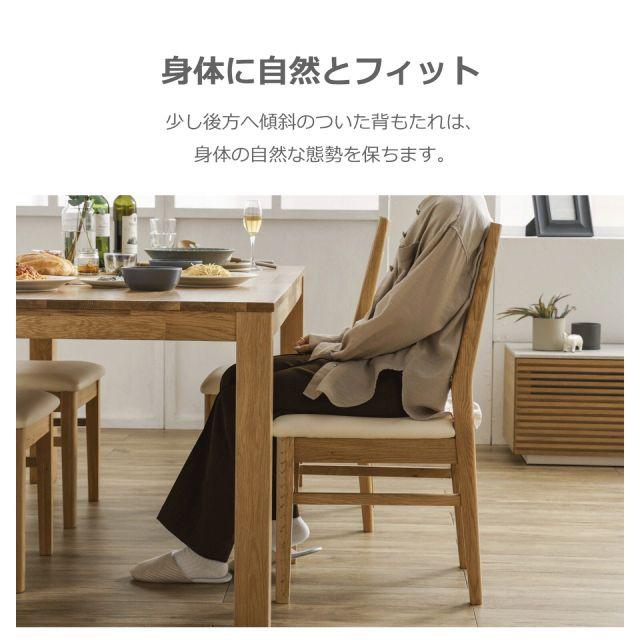 贅沢に無垢材を使用した、温かみあふれるダイニングチェア。少し後方へ傾斜のついた背もたれは、背の当たりも痛くなく、身体に自然にフィットし、やさしくサポートしてくれます。
