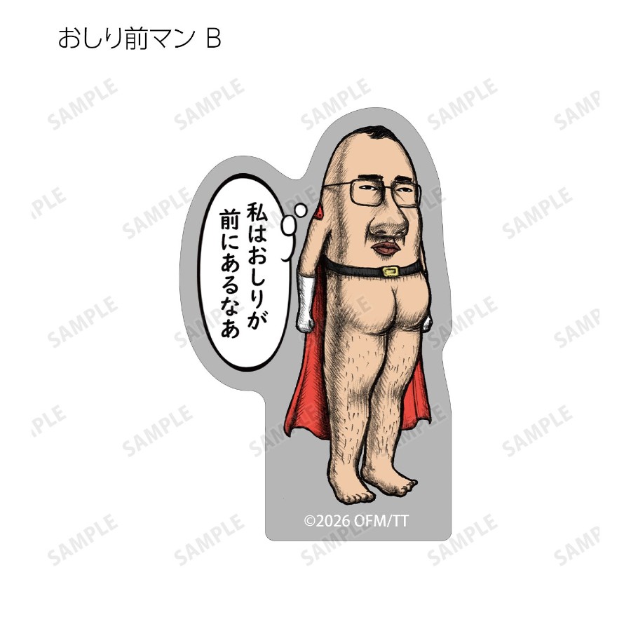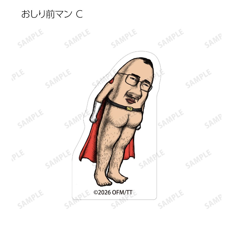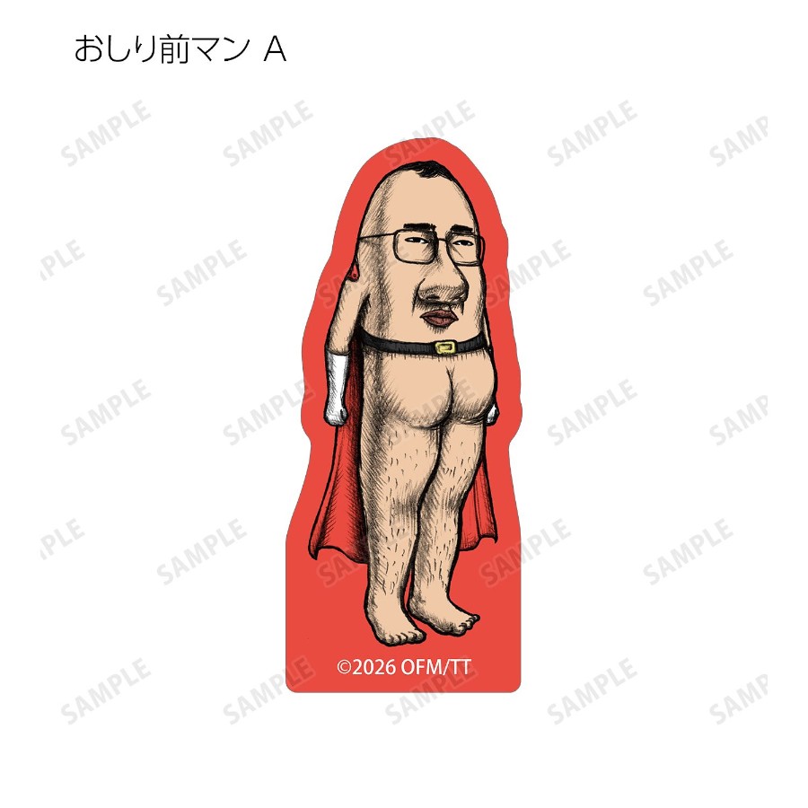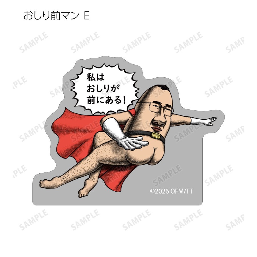 『おしり前マン~復活のおしり前帝国~』より、トレーディングアクリルマスコットの登場です。 おしり前マン、おしり前レジェンド、黒幕製薬の社長、おしり前姫のカラーイラストをアクリルマスコットに仕上げました。 厚さ8mmのアクリルとなっており、台座無しで自立するため、そのまま飾ったり、並べることもできます。 お部屋やデスクまわりなどに飾って、キャラクターとの日常をお楽しみください。
